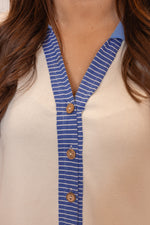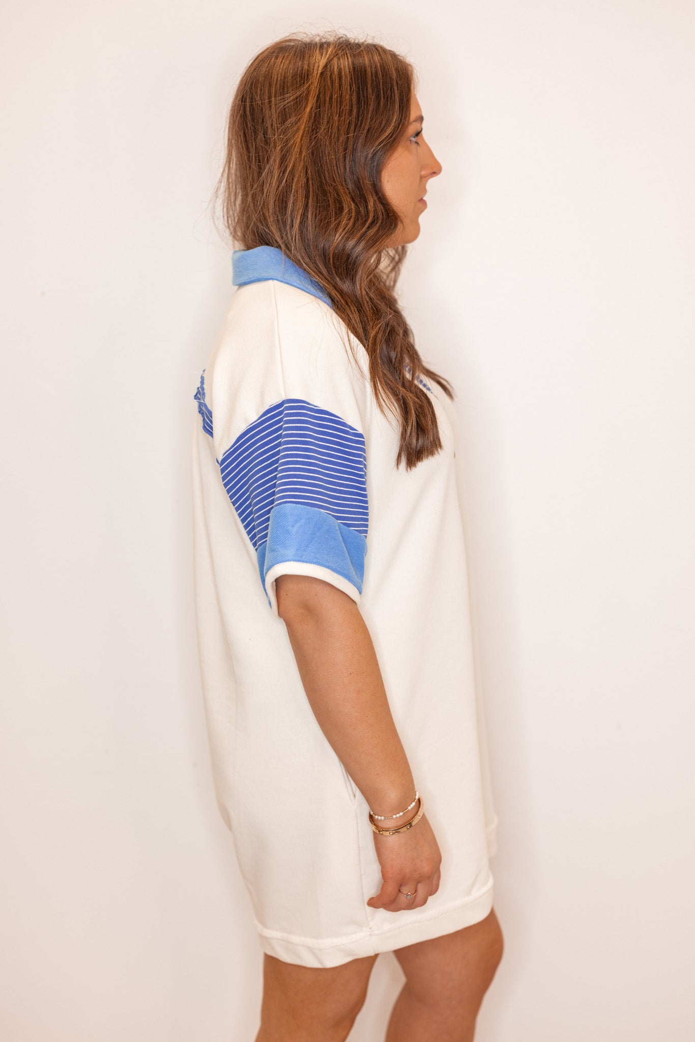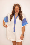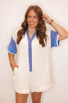 Get cozy in style with our Colorblock Favorite Off White Romper! Made of soft french terry knit fabric and featuring unique blue striped colorblock details, this romper is both comfortable and eye-catching. The button front and collar add a touch of sophistication to this playful piece. Perfect for lounging or a day out!