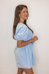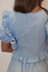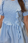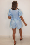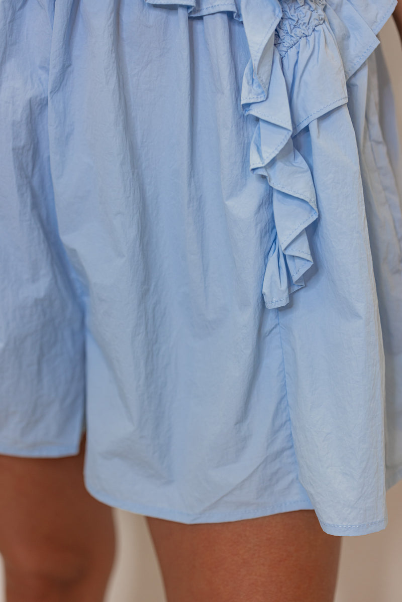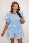 Join in on the fun with our Sunrise Soiree Blue Smocked Romper! Made with light blue lightweight fabric, this romper features a smocked bodice for a comfy fit, ruffle trim details for a touch of playfulness, and wide legs for a breezy look. Perfect for any summer party or event!