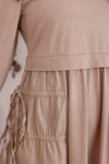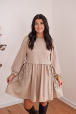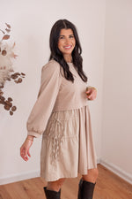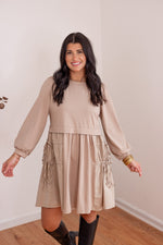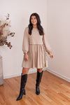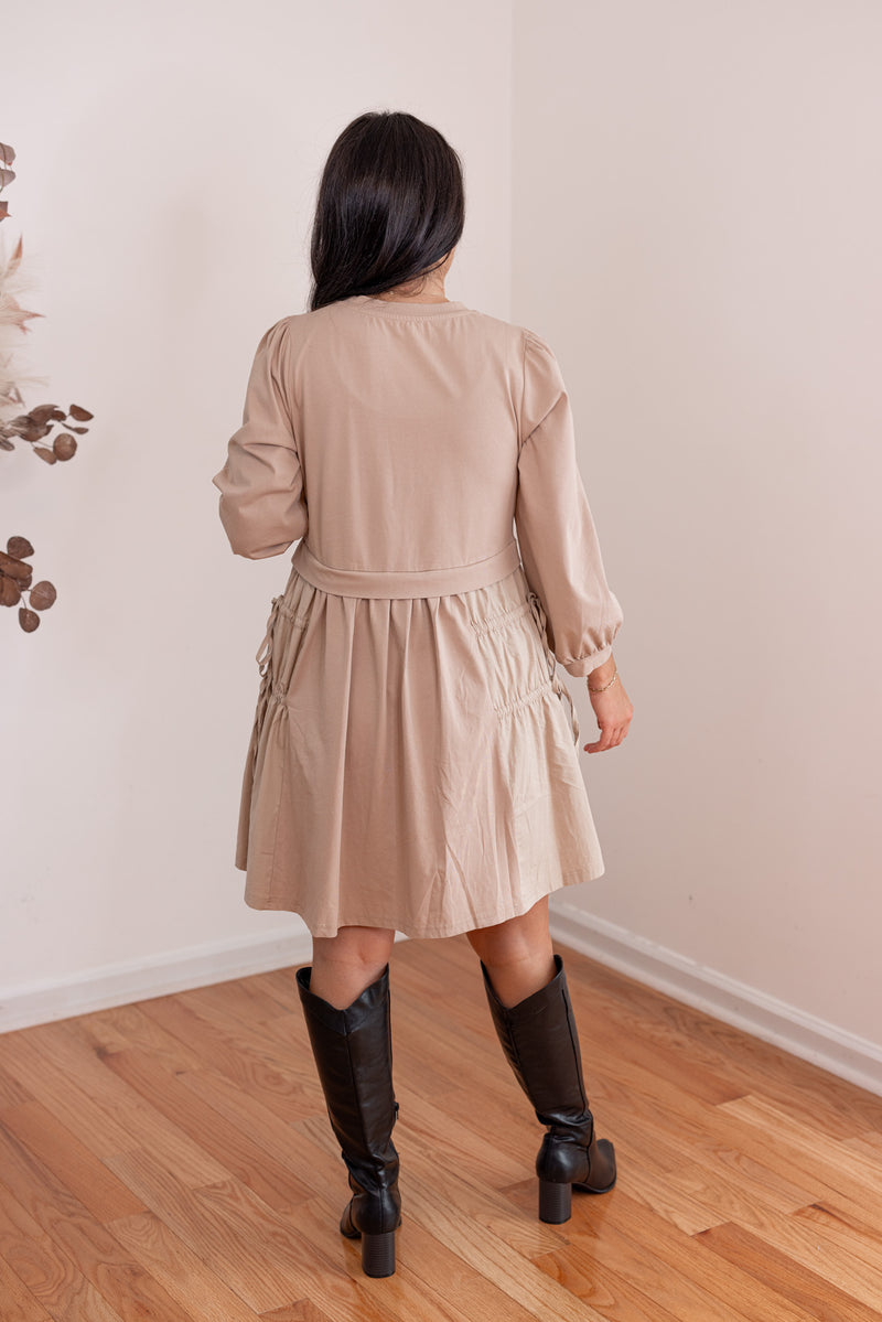 We just LOVE a contrasting fabric dress! Introducing Monochromatic Perfection, our new favorite outfit! She is taupe knit fabric mixed with taupe woven fabric, and features a crew neckline, balloon sleeves, and adjustable cinch ties down each side of the skirt. Perfect for every season - looks so cute paired with THIS VEST!!