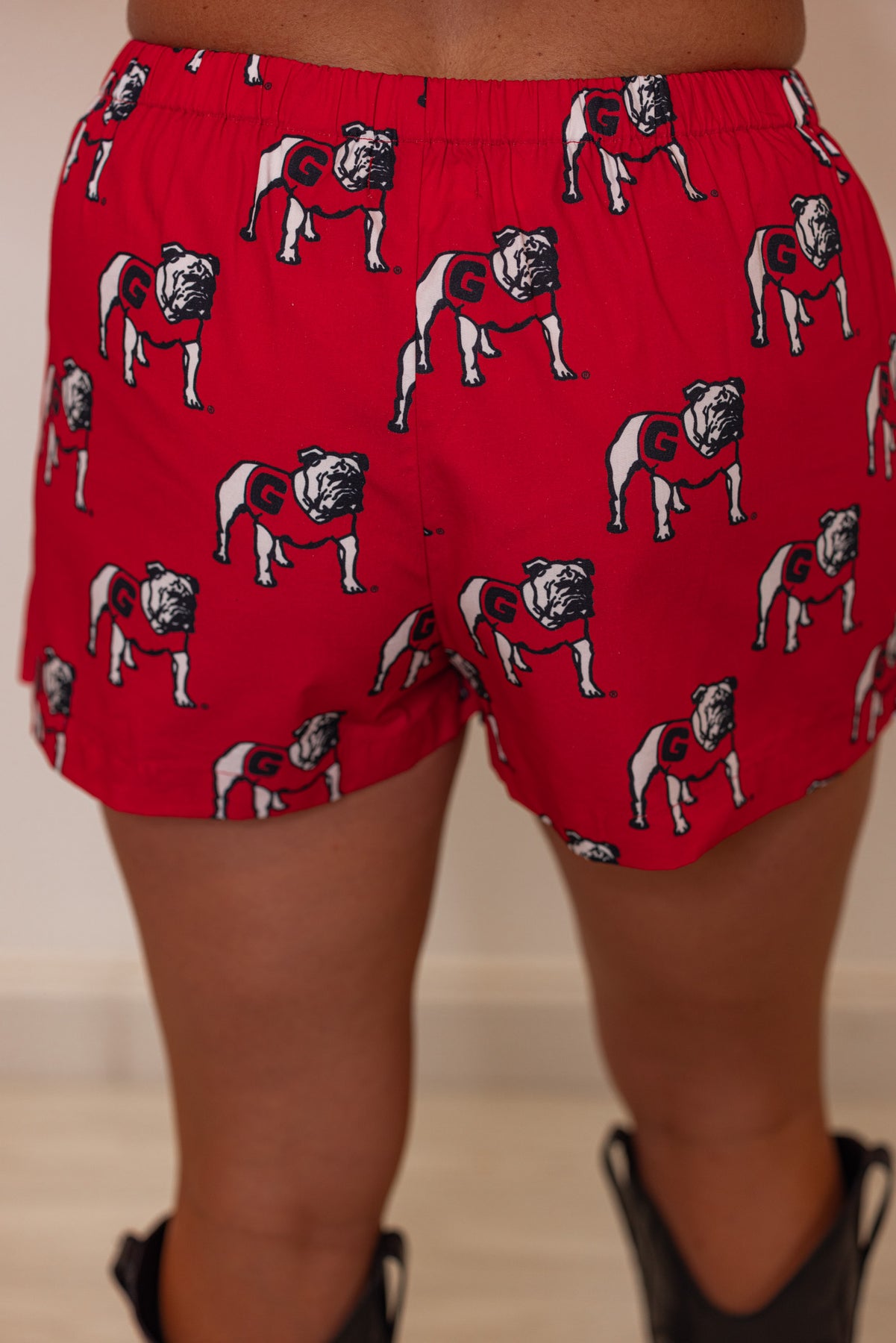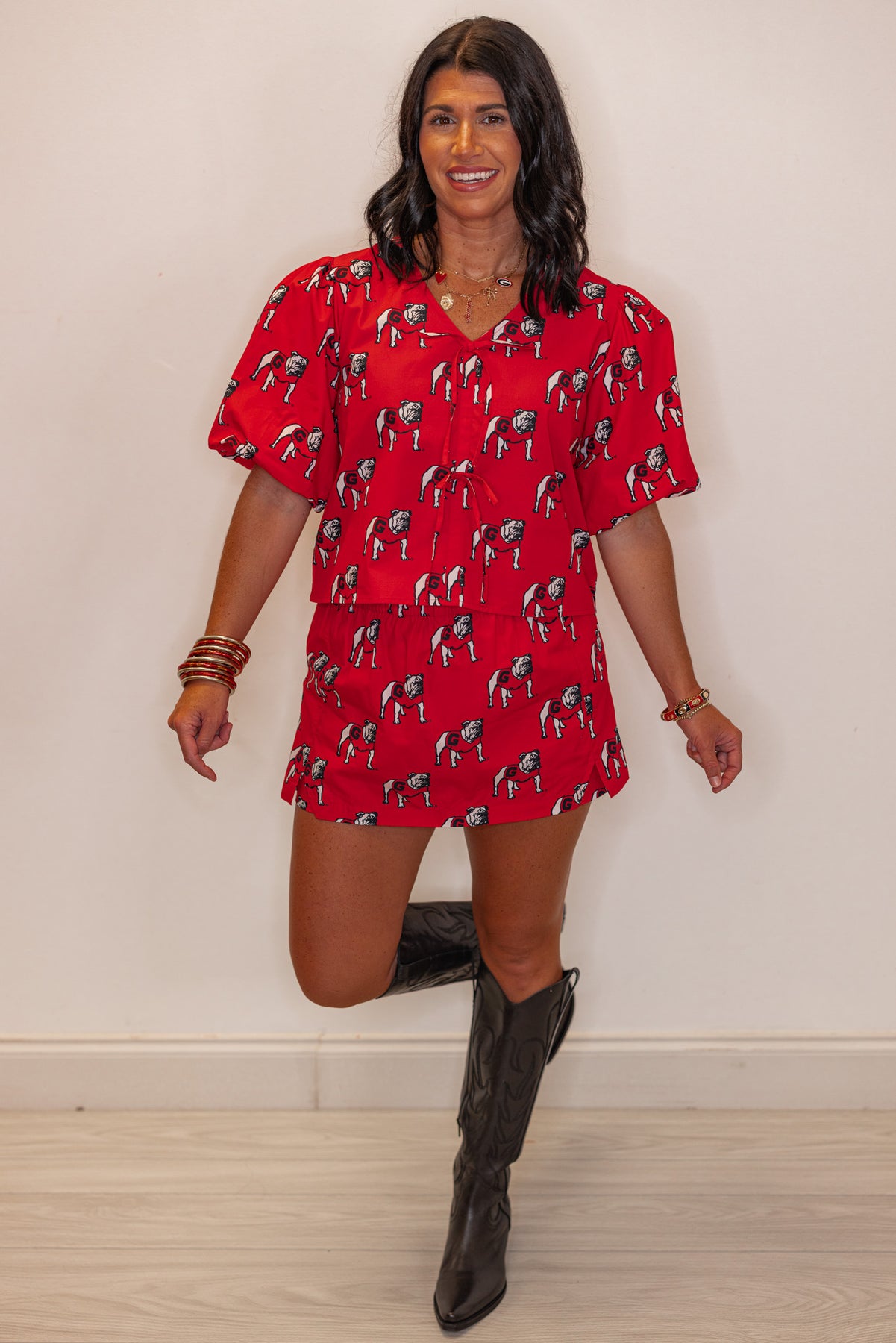 Womens red Bulldogs poplin skort by Stewart Simmons showing up close view of bulldog print