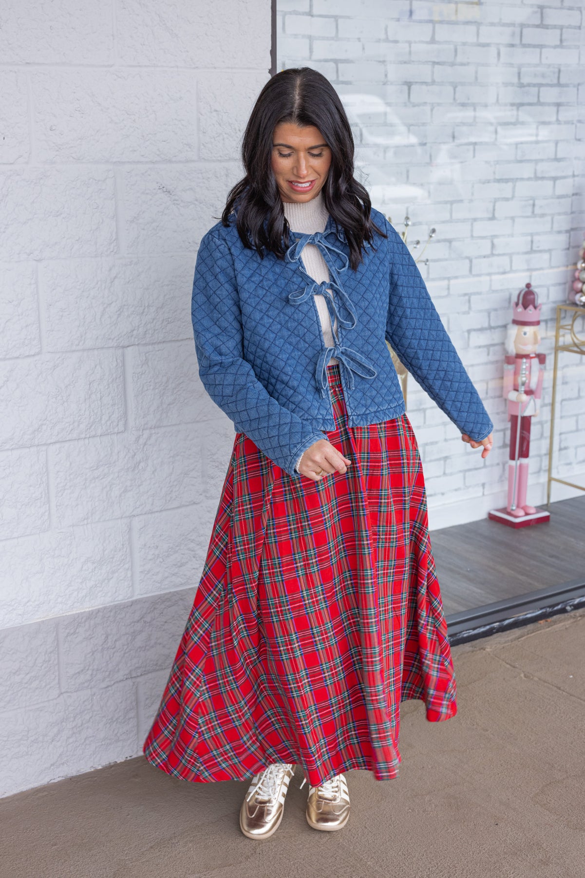 Add a splash of festive fun to your wardrobe with the Plaid Indulgence Red Midi Skirt! Featuring a vibrant red and green plaid pattern, this skirt offers a smooth front with an elastic waistband at the back for comfortable fit and easy movement. The hidden hook and eye zipper on the side keeps your look sleek and polished. Pair it with this cozy red sweater top or this chic classic quilted denim jacket for a perfectly coordinated outfit that’s ready to turn heads wherever you go!