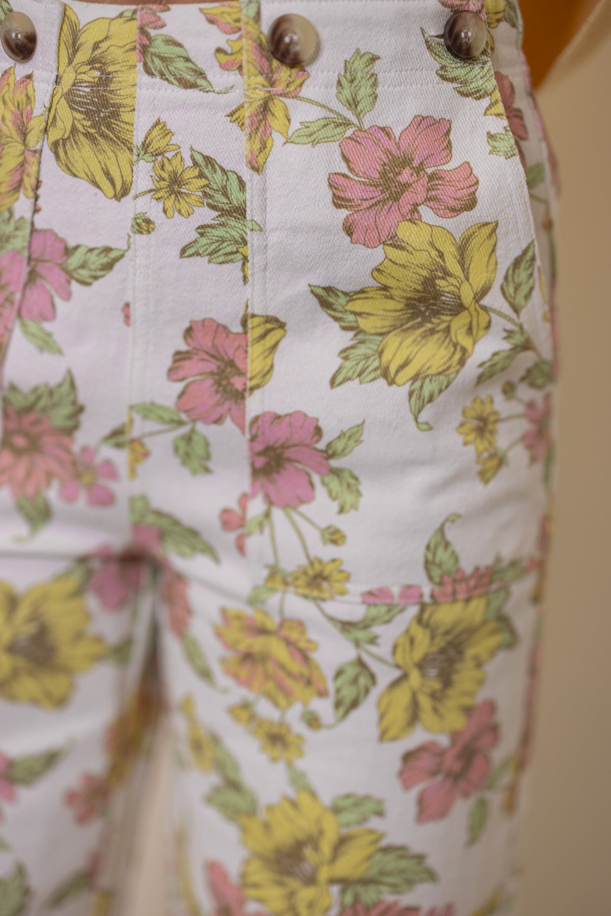 These cream twill pants are pure statement-making magic! Featuring a vibrant floral print in pink, yellow, and green, they bring instant personality to any outfit. The wide-leg silhouette offers a flattering, modern fit, while decorative button details at the waist add a touch of playful charm. A hidden zipper closure keeps the look sleek and polished. Perfect for anyone ready to bloom with confidence and style! Shop the look: Yellow Ribbed Top
