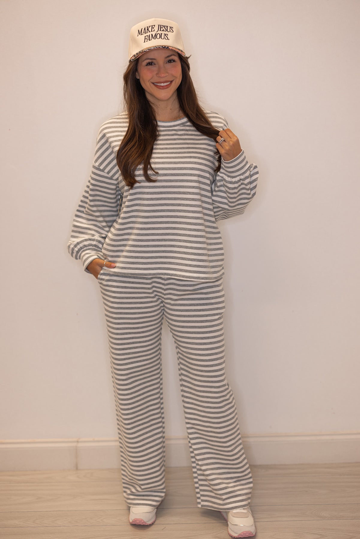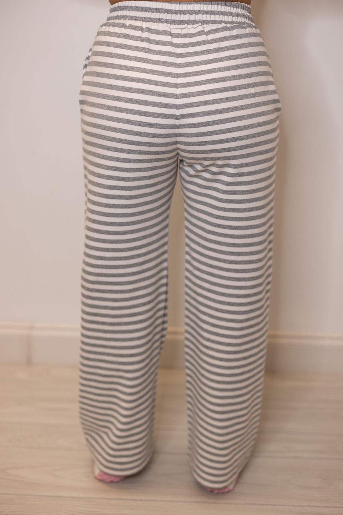 Wrap yourself in buttery soft fabric with these Good Energy grey striped lounge pants, designed for ultimate comfort and style. The adjustable drawstring waist gives you the perfect fit every time, while the relaxed cut makes them ideal for lazy days at home or casual outings. Mix and match with the coordinating top to nail that adorable matching set look!