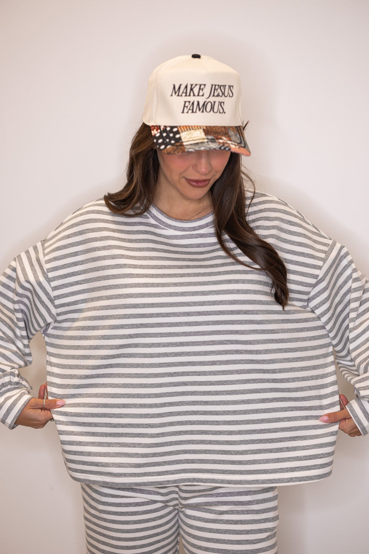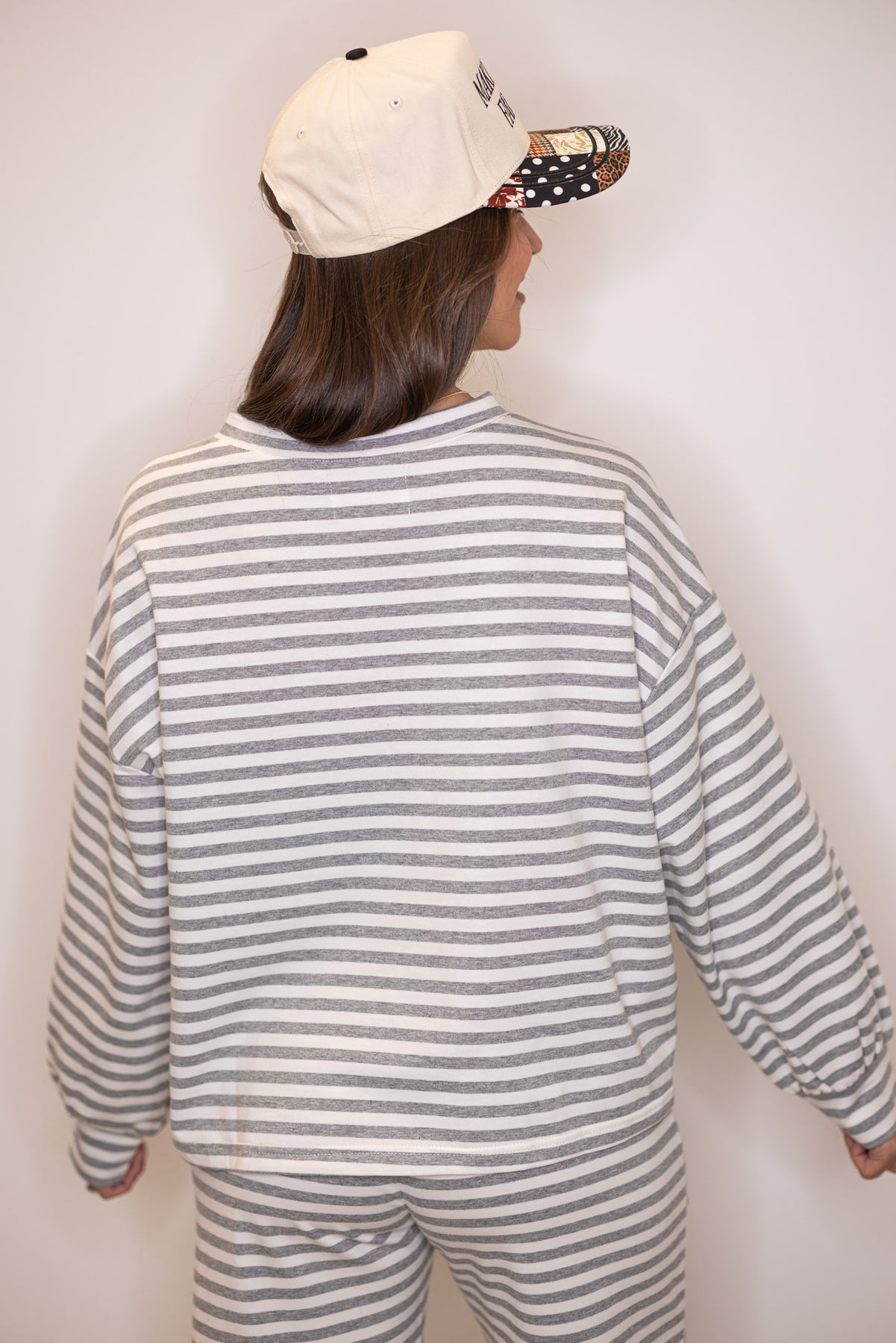 Women's grey striped lounge top shown with matching pants