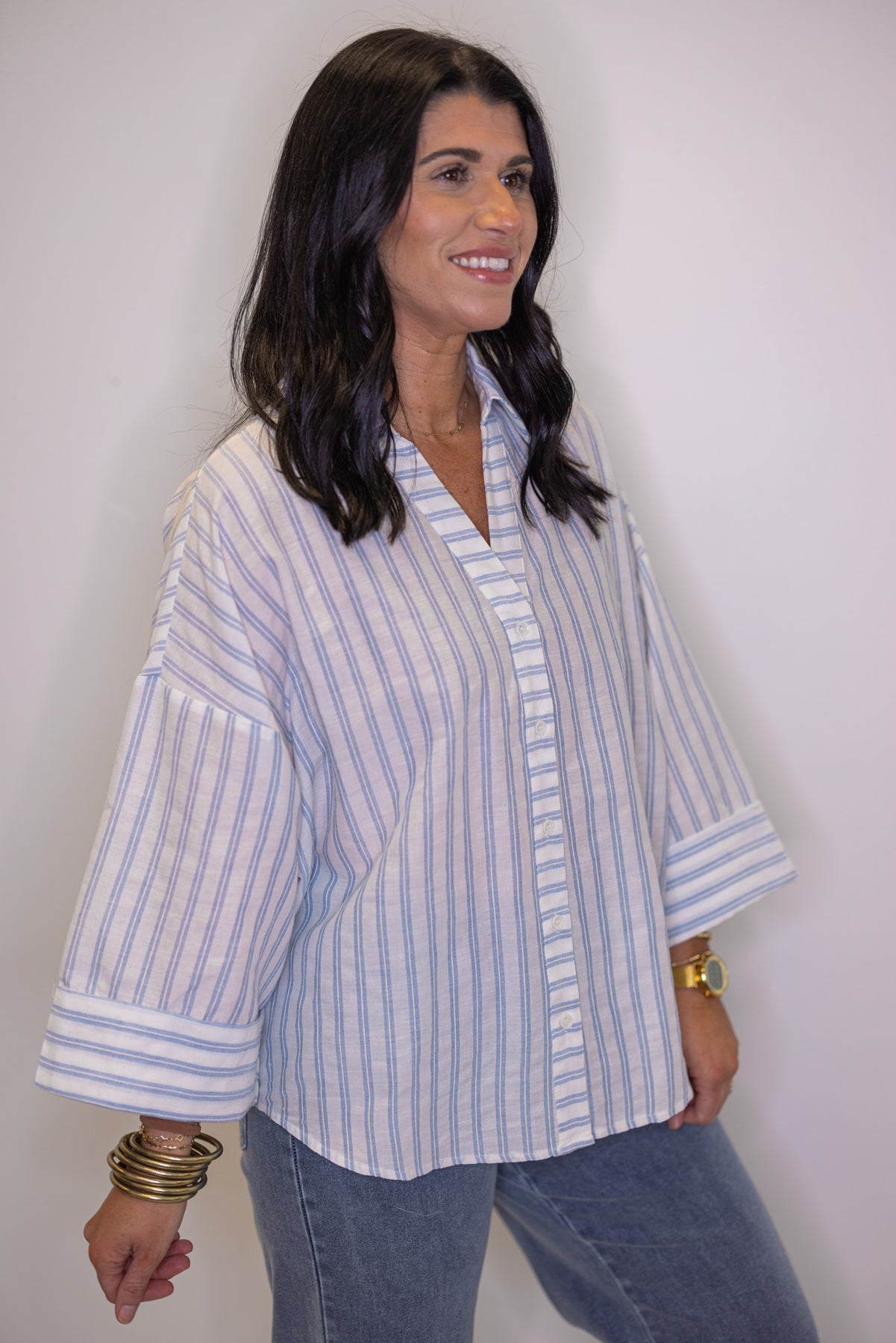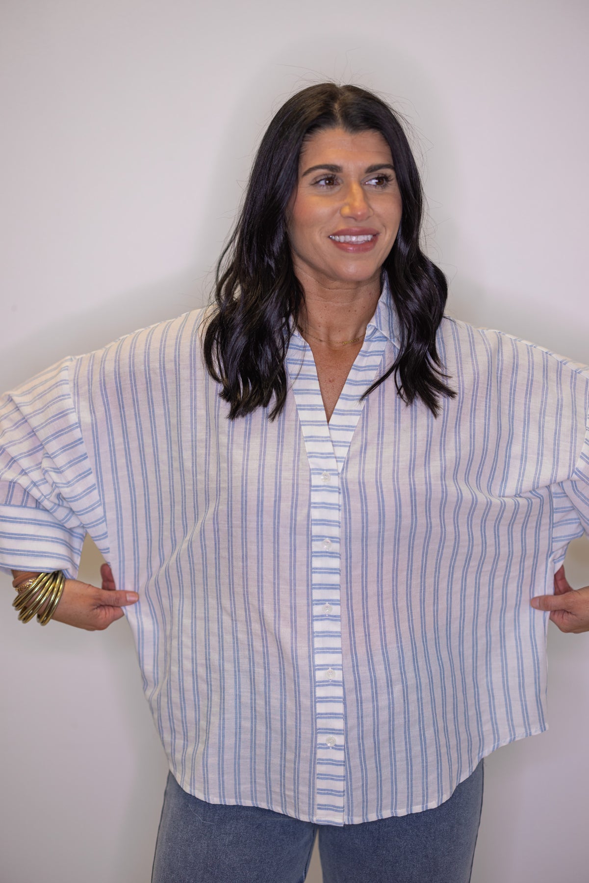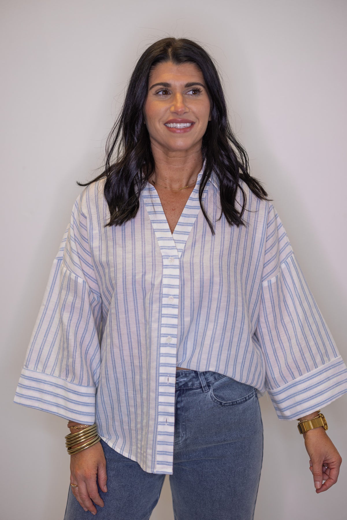 Stripes never go out of style—especially when they're this charming! This light blue and cream striped button-down features a flattering V-neckline with collar and breezy 3/4 length wide sleeves that make it the ultimate transition piece. Dress it up with tailored trousers or keep it casual with your favorite jeans. Whether you're layering it over a tee or wearing it solo, this top is ready for whatever your day brings!