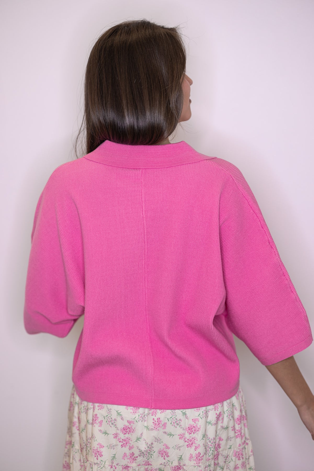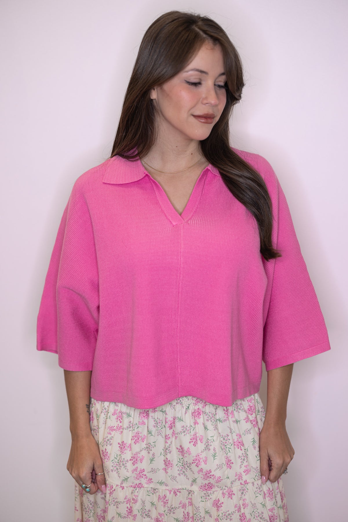 Effortlessly chic meets cozy comfort in this pink ribbed knit top! The structured v neckline with collar adds a polished touch, while the boxy silhouette keeps things relaxed and flattering. 3/4 length sleeves strike the perfect balance between coverage and style. Layer it, dress it up, or keep it casual—this versatile piece is your new go-to for looking put-together without trying too hard! Shop the look: Floral Maxi Skirt