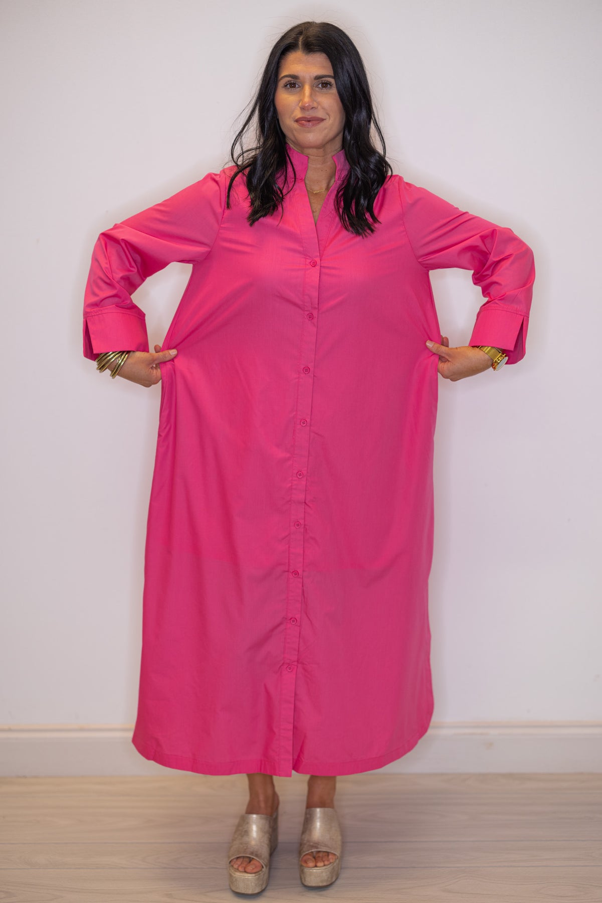 Meet your new go-to dress that does it all! This timeless pink midi features a fun button front closure and flattering v neckline that lets you show off your personal style. The 3/4 sleeves with trendy slit cuffs add just the right amount of edge, while those clever side slits keep things comfortable and breezy. Whether you're dressing it up for a night out or keeping it casual for weekend adventures, this versatile piece is ready for whatever comes your way. Simple, stylish, and seriously wearable—what's not to love?