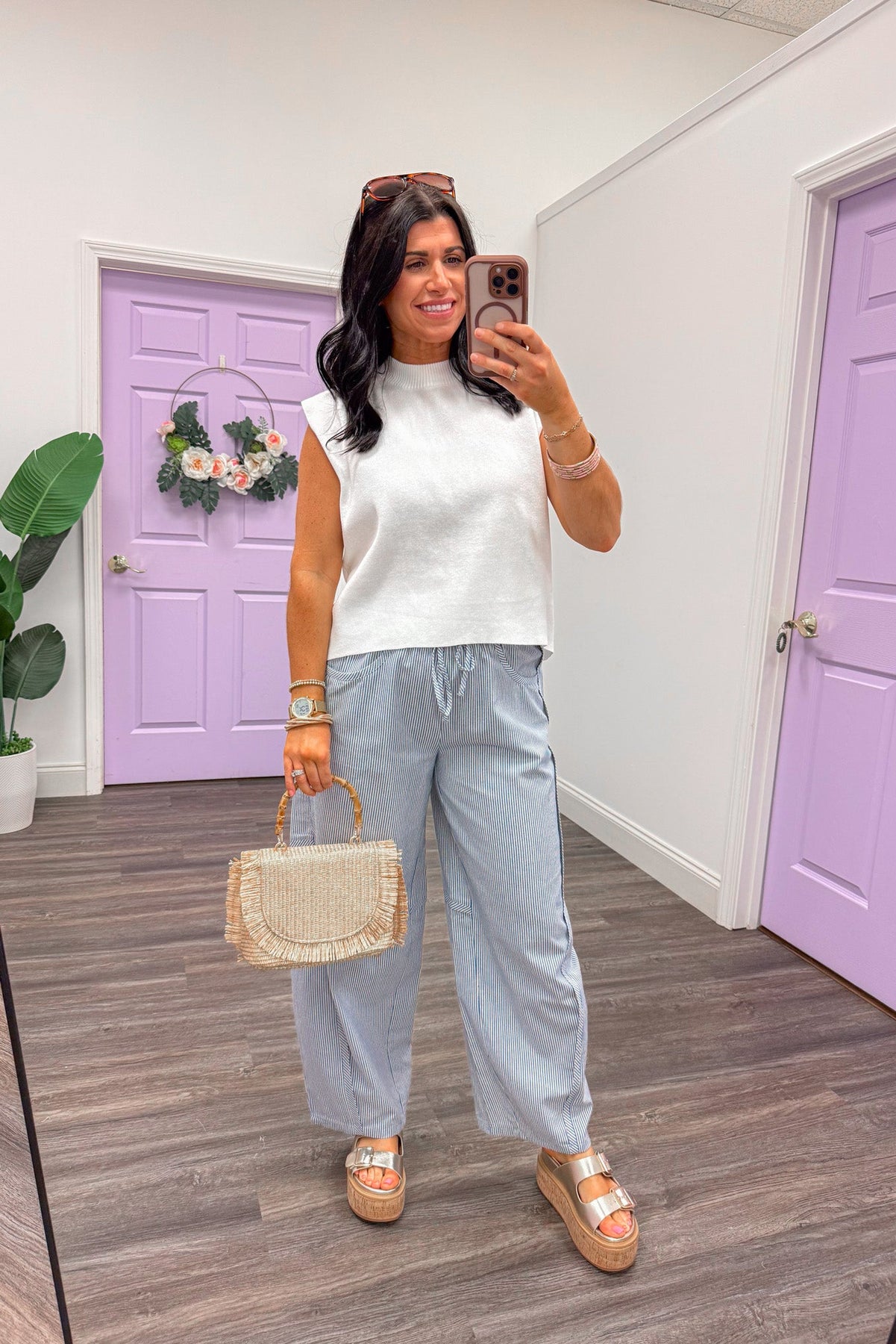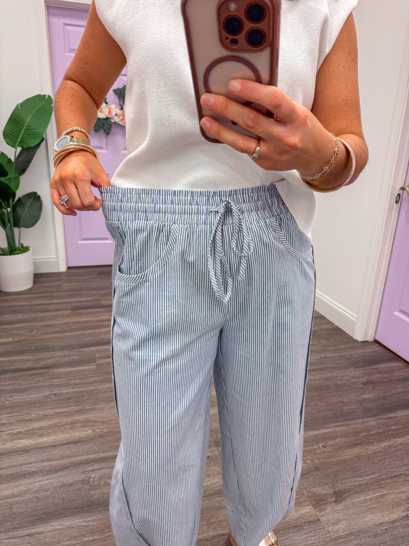 Slip into effortless style with these breezy barrel pants that celebrate comfort without compromise. Featuring blue stripes and a relaxed silhouette, they're designed with a forgiving elastic waistband and adjustable drawstring for the perfect fit every time. Lightweight and breathable, these pants are your new go-to for laid-back days that still look put-together. Shop the look: White Knit Top | Sandals