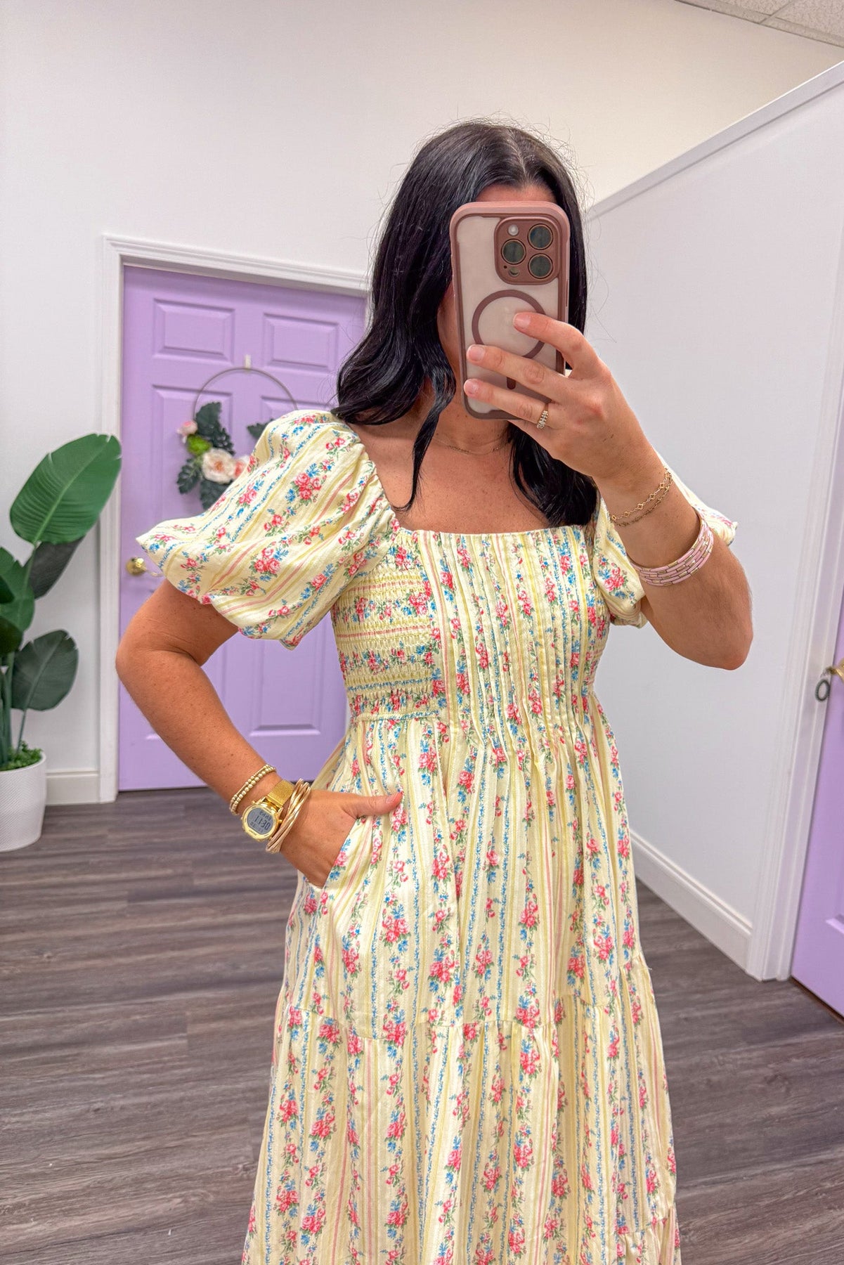Brighten your spring wardrobe with this cheerful butter yellow midi dress! Adorned with delicate floral details, it features charming bubble sleeves and flattering smocked panels along the sides and back for a feminine silhouette. The soft, romantic design captures all the best spring color vibes in one irresistible piece.