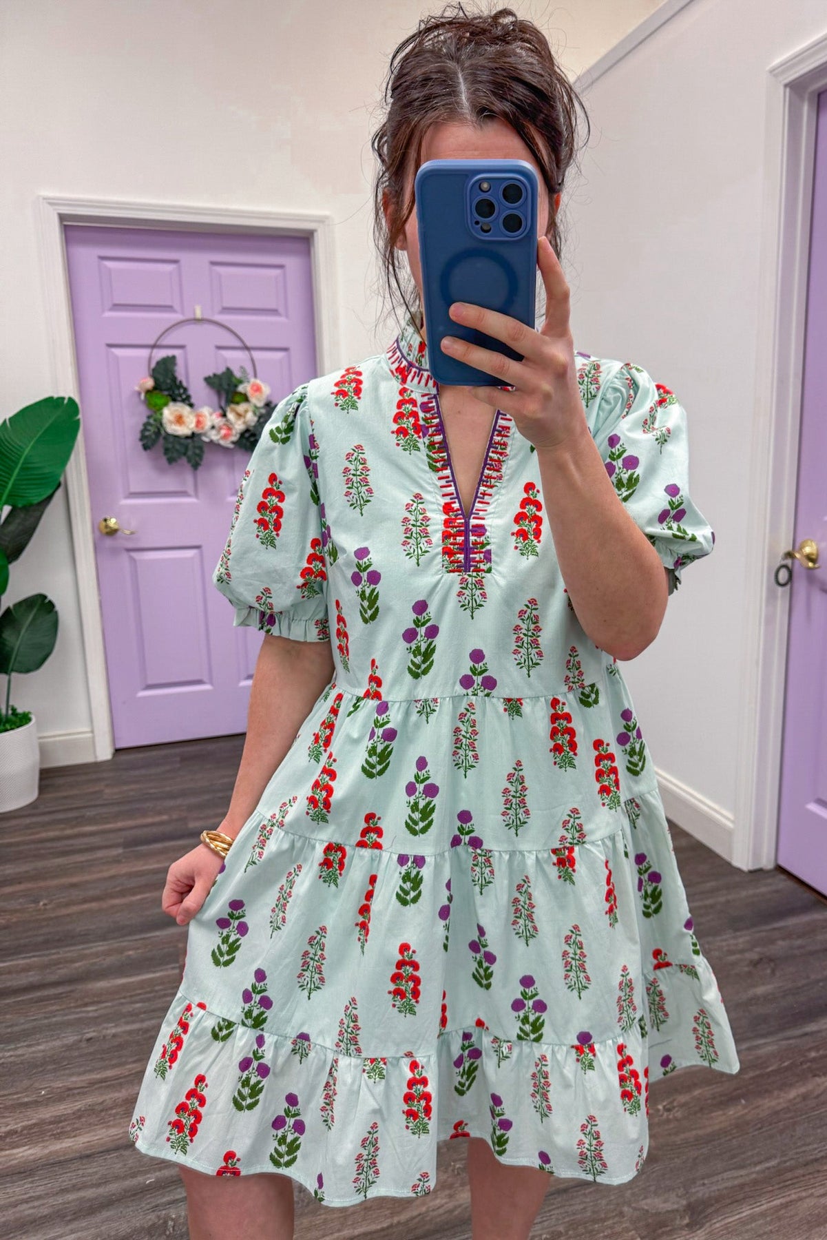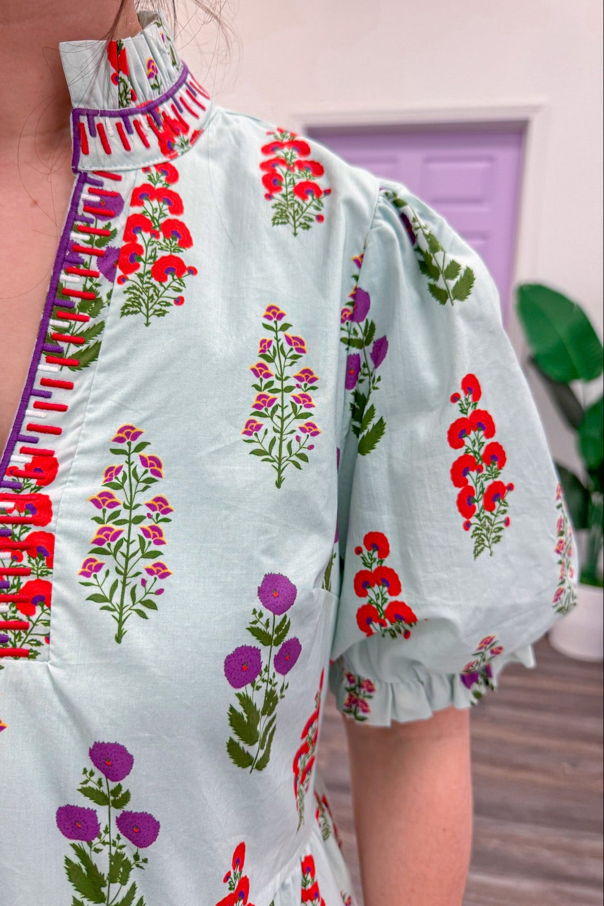 Twirl into the spotlight in this show-stopping mint floral dress that's bursting with personality! Featuring a gorgeous light mint base adorned with vibrant red, purple, and green florals, this dress is pure joy. The flattering V-neckline is framed with coordinating red and purple embroidery trim for an extra touch of sass. Puff sleeves add a playful dimension, while the tiered skirt with ruffled hem creates movement and drama with every step. Perfect for anyone ready to make a bold, colorful statement!