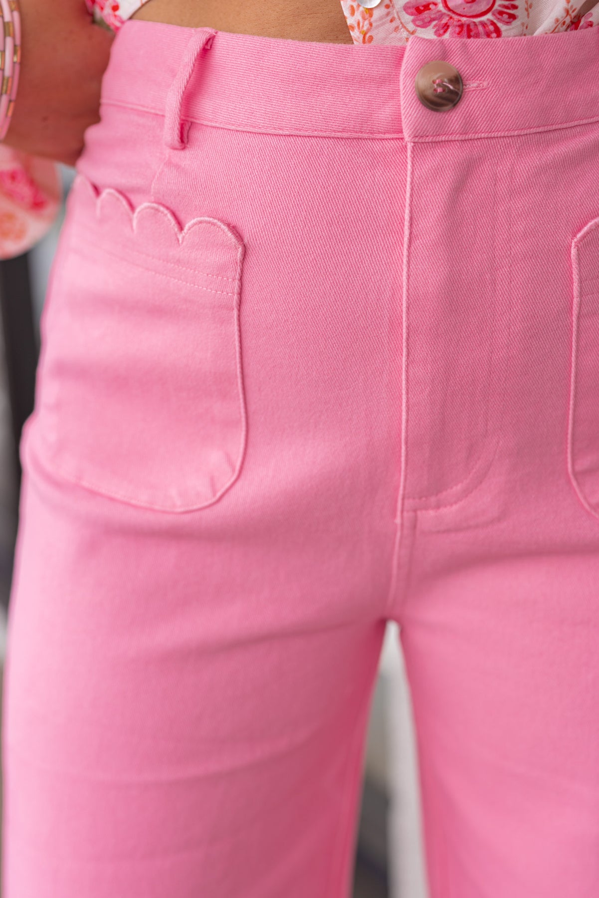 These pink twill pants are pure scalloped magic! Featuring a vibrant pink twill denim fabric, they bring instant personality to any outfit. The wide-leg silhouette offers a flattering, modern fit, while scalloped embroidery trim details add a touch of playful charm. Perfect for anyone ready to stand out with confidence and style! Shop the look: Floral Printed Top