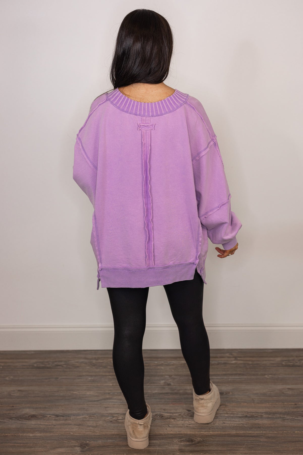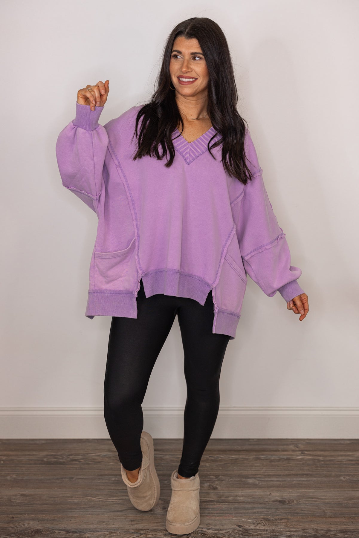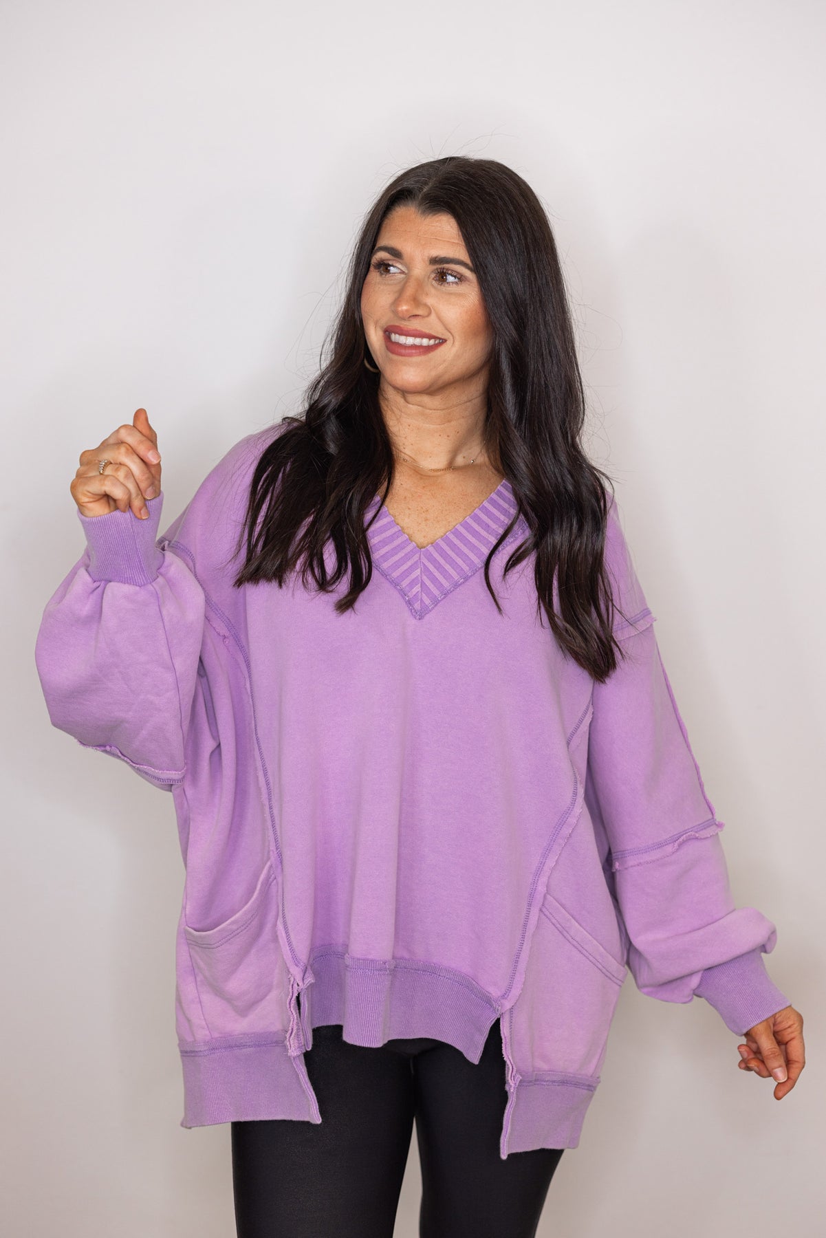 Indulge in your Cozy Era with this adorable washed lavender purple pullover! Featuring french terry knit fabric, a v neckline, and long balloon sleeves, all in a comfy oversized fit. Perfect worn with jeans on her own with sneakers, or off the shoulder layered over a cute tank or bralette, paired with boots. So versatile!