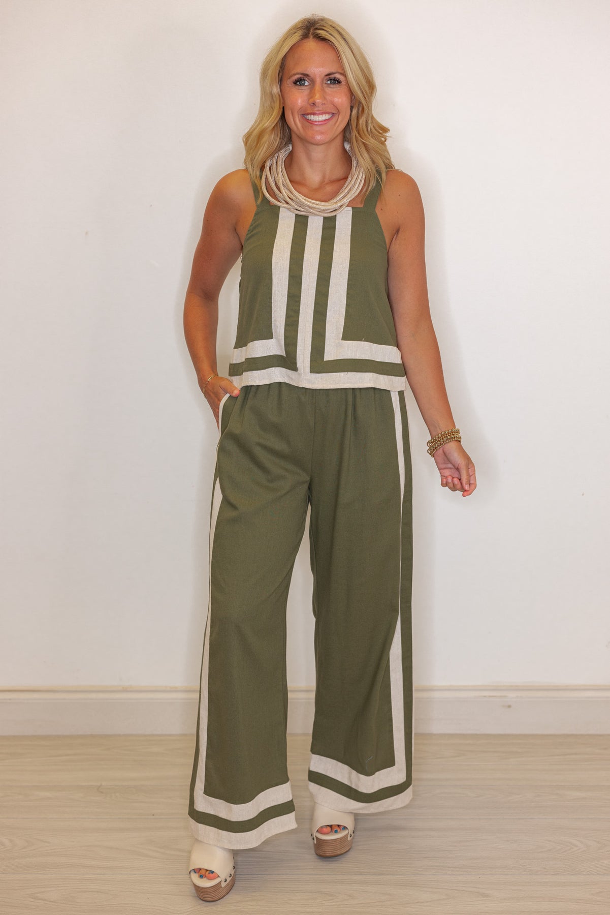 Embrace effortless style with the Dreamy Escape Olive Linen Top! This sleeveless gem features a charming square neckline and adjustable shoulder straps for the perfect fit. The oatmeal trim detail adds a subtle touch of whimsy, making it a playful staple for sunny days. Pair with the matching pants for a breezy, coordinated look that’s ready for any adventure!