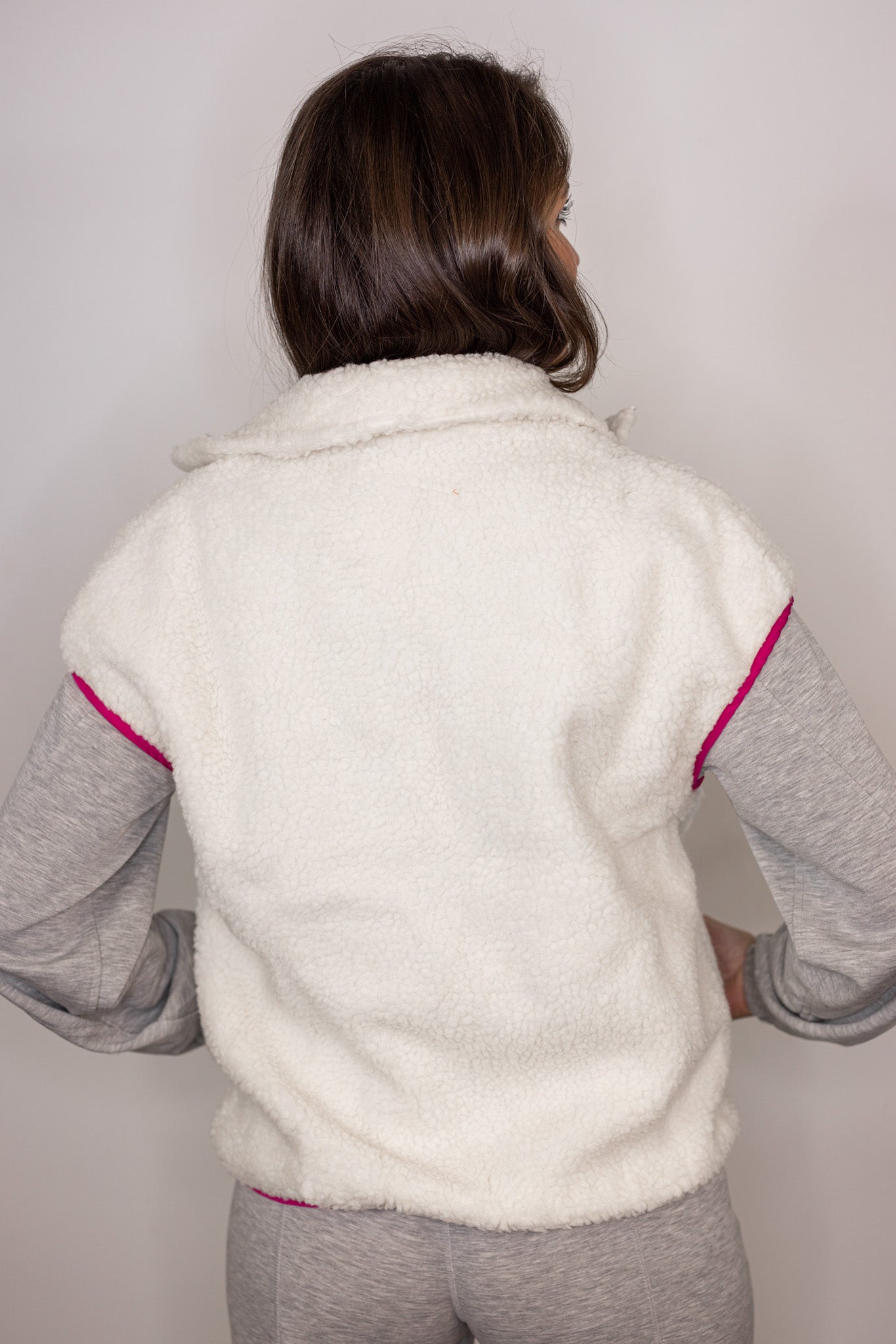 Off white teddy fur sherpa fleece vest with hot pink puffer colorblock trim