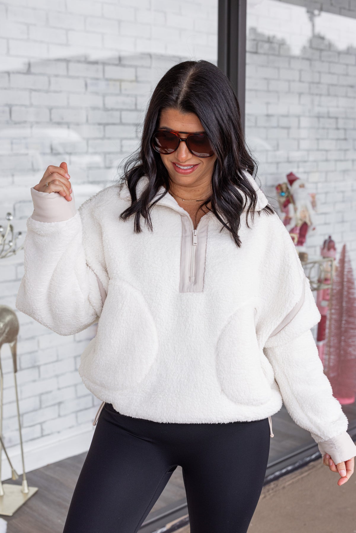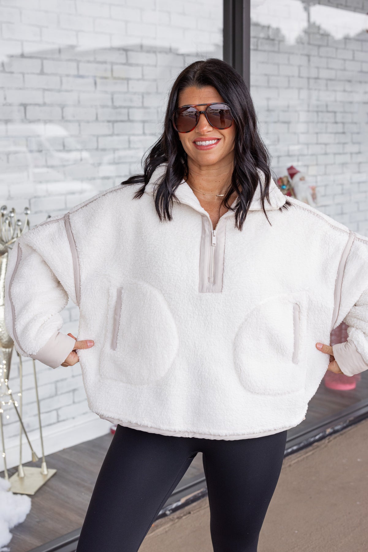 Wrap yourself in cozy vibes with this dreamy ivory sherpa pullover that's basically a hug you can wear! The plush sherpa fabric pairs perfectly with sleek light beige trim for a chic contrast that keeps things sassy. Featuring a convenient quarter zip closure for easy slip on, then stash your essentials in the front pockets—because pockets make everything better. Perfect for lazy days, coffee runs, or whenever you need maximum comfort without sacrificing style!