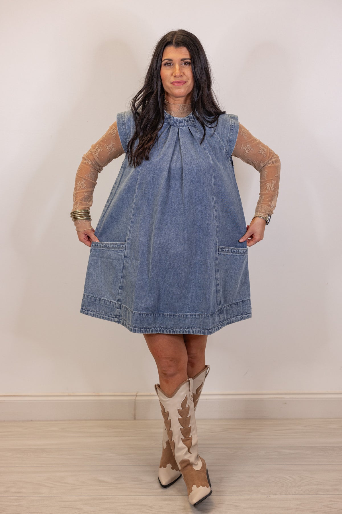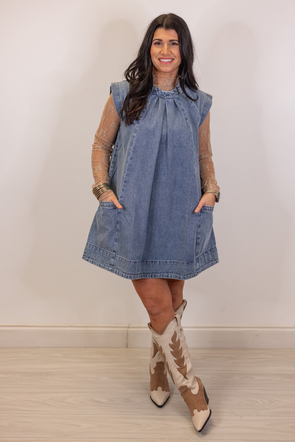 Embrace total perfection in this Denim Perfection Washed Blue Dress! The mineral washed denim exudes effortless cool and the sleeveless design is perfect for warmer weather. With a crew neckline and pleated front detail, this dress is sure to make a fun statement - perfect for any occasion!