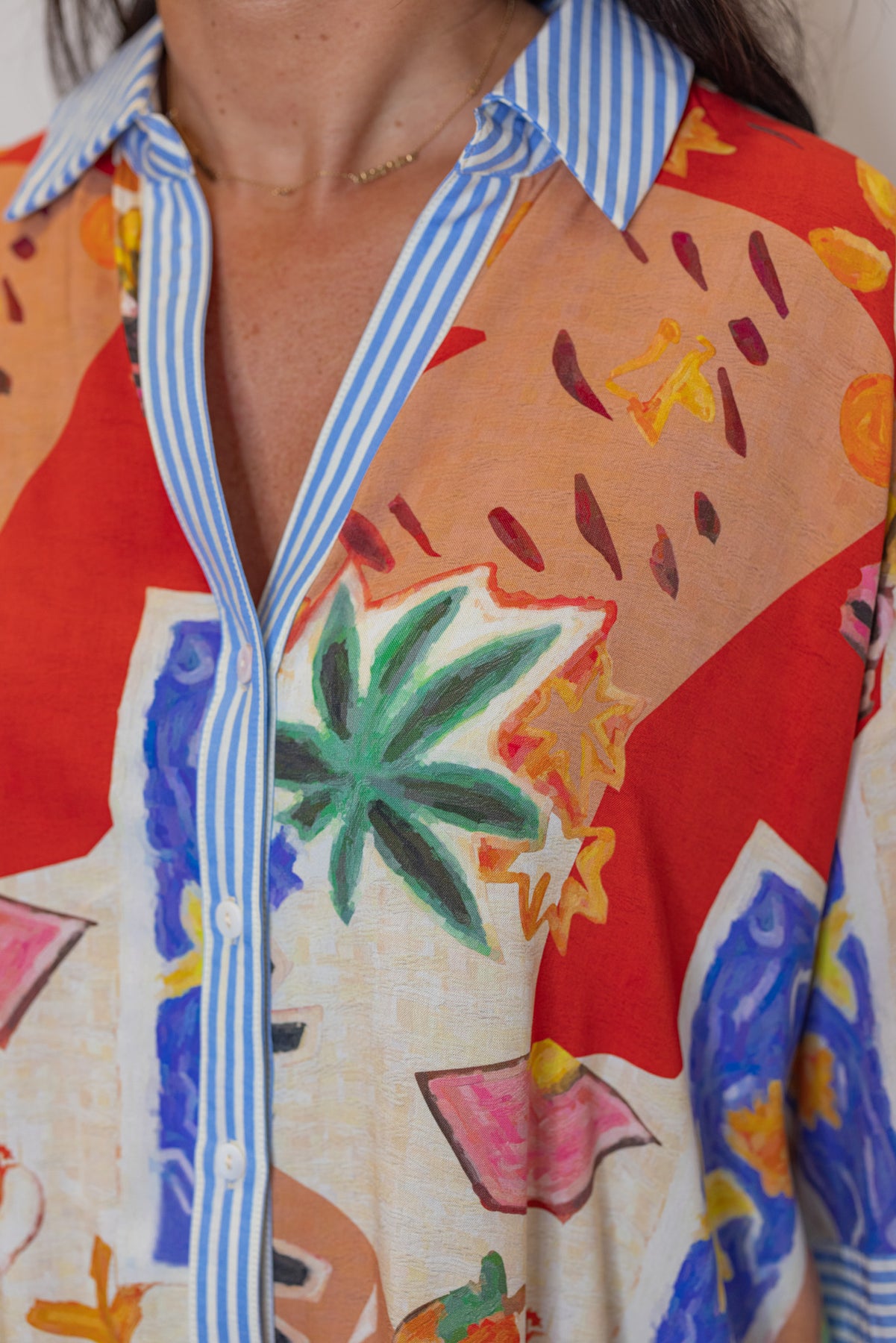 Get ready to dream in color with our Abstract Dreaming Cream Multicolor Top! Featuring a cream multicolor bold abstract print with blue and white trim, this button down top is sure to make a statement. Perfect for adding a pop of color to any day out! Shop the matching pants here for the dreamiest outfit around!