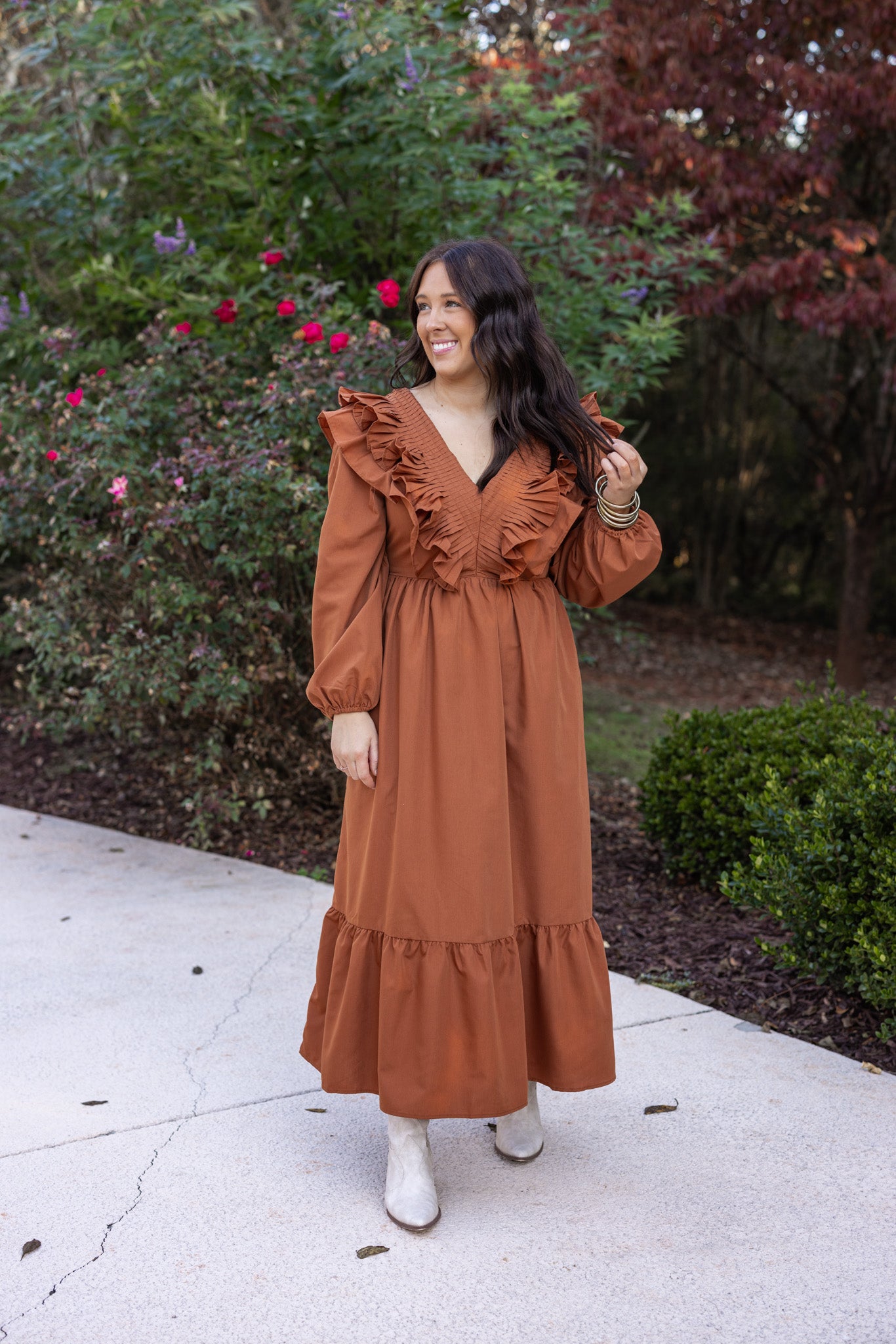 Embrace the joy of Autumn with our new fave midi - Autumn Chic! Featuring the prettiest dark caramel fabric, with a v neckline and ruffled v bodice in front and back with decorative stitching detail, and long balloon sleeves. You'll feel just like the bell of the Autumn ball! Perfect for all of those upcoming celebrations!