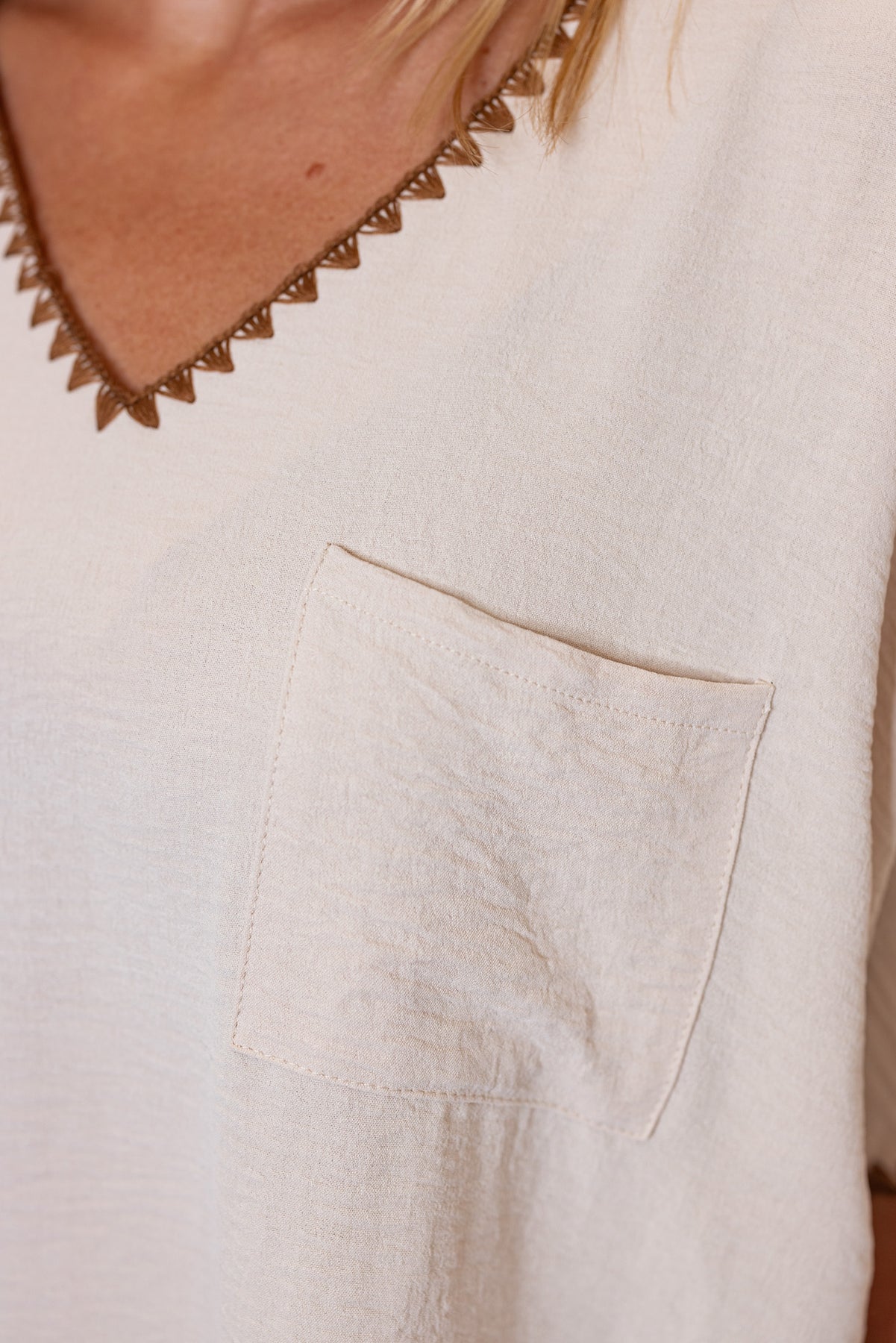 Escape to your Beach Retreat in this adorable oatmeal crinkle top! This lightweight babe features a v neckline, short sleeves, and side slits in the bottom hem - all trimmed out in brown scalloped embroidery. Too perfect! Grab this cutie and stroll right into your favorite season!