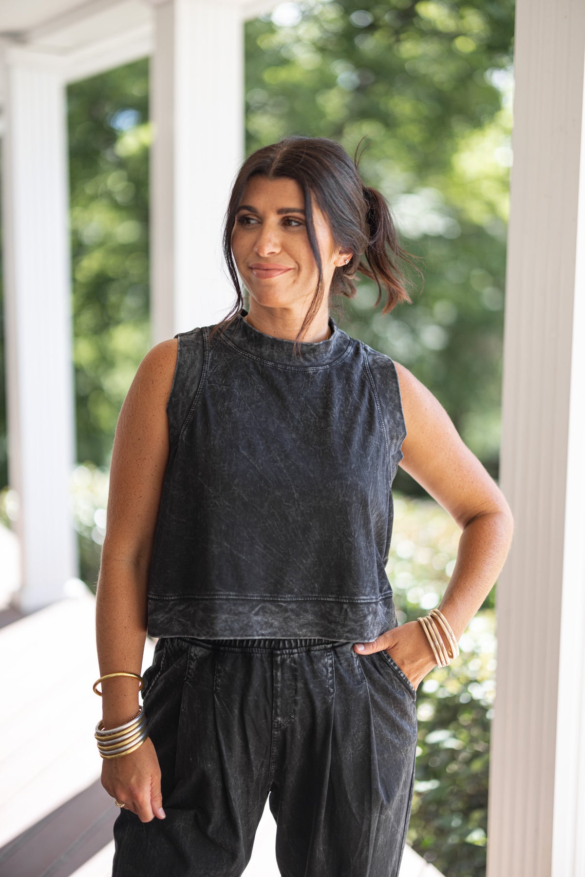 Elevate your style with the perfect blend of comfort and sophistication with our chic sleeveless cropped top. Crafted from breathable fabric, this trendy top is not only stylish but also incredibly comfy. The mineral wash adds a unique touch, giving it a distinct and fashionable look. Pair it effortlessly with the matching pants for a complete ensemble that's perfect for the spa, lounging at home, casual outings, picnics, or wherever your day takes you!