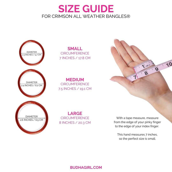 BuDhaGirl Crimson All Weather Bangles® are made of polyvinyl carbonate tubing that is a semi-flexible material, so there is a little give when you slide the bangles over your hand. This really is the key to deciding your size... how the bangles go over your hand, not the size of your wrist.