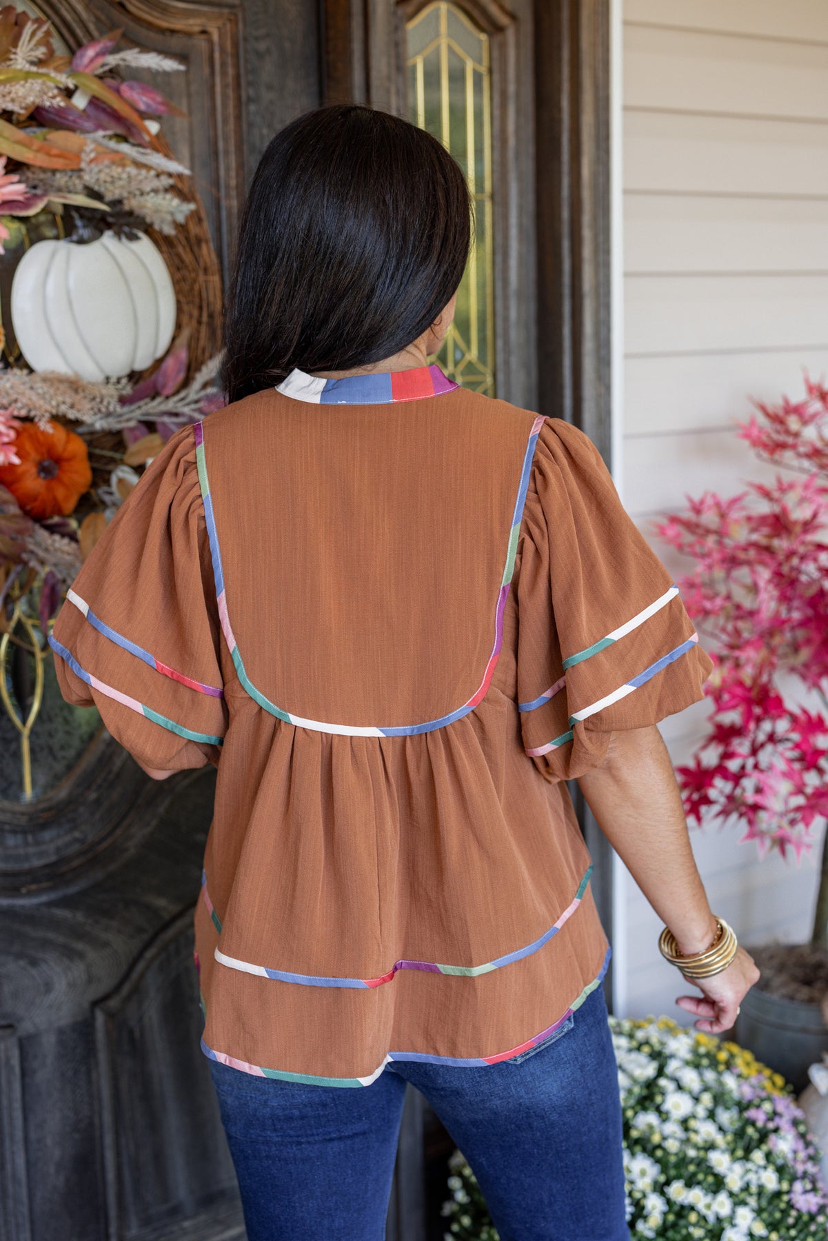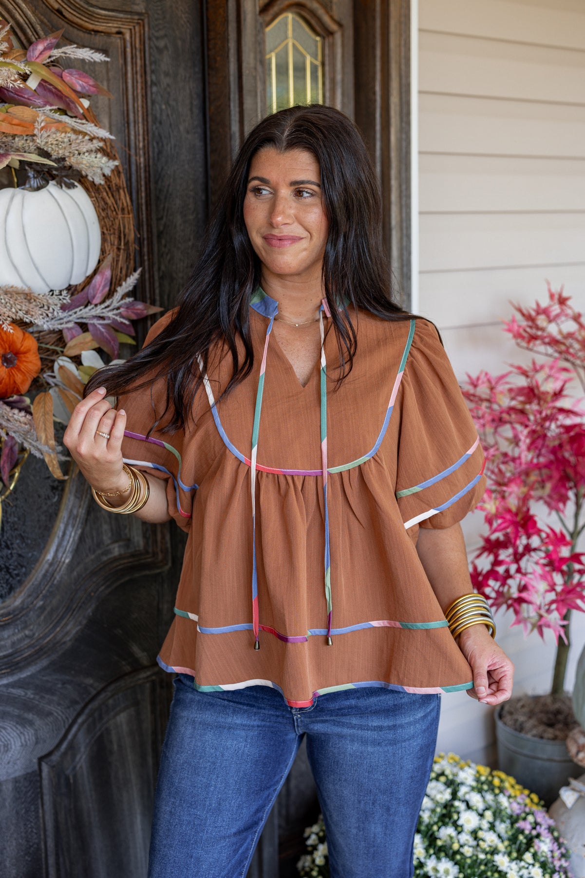Get inspired this season with our Fall Sunsets Caramel Babydoll Top! Made with caramel fabric, featuring a v neckline with self tie detail, and short puff sleeves. She has beautiful multicolor piping trim throughout, for a unique and playful touch. Perfect for adding a pop of color to your wardrobe. Super cute dressed up with heels, or worn with boots/sneakers for a more casual day out!