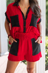 Get ready to shine in these Colorblock Glam Red Rhinestone Shorts! Featuring crinkle gauze colorblock fabric in red and black, a smocked elastic ruffled waistband, and adorned with sparkling rhinestone trim. Perfect for adding a touch of glamour to your wardrobe! Super cute with sneakers or boots. Pair with the matching top for a fab UGA gameday outfit! Gooo DAWGS!!