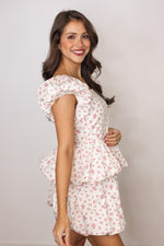 Embrace your girly side with this poplin cream peplum top featuring a square neckline, short puff sleeves, and a bubble hem. The dainty pink floral print adds a touch of sweetness to any outfit! Pair it with the matching skirt for a complete Dainty Florals look. Too perfect!