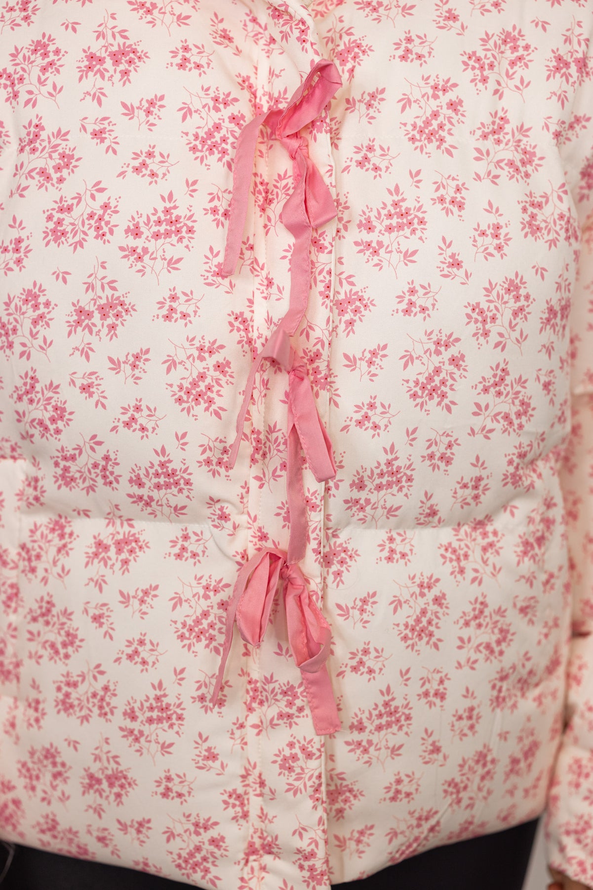 Be the trendiest one around in our Dainty Pink Floral jacket! Stylish and functional, this quilted puffer will keep you warm while being fabulous! Featuring a hidden zip front closure with ribbon bow ties over the zipper. Take on the chilly season in effortless style! Colors: cream with pink floral print.