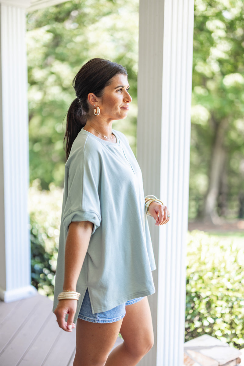Look fabulous while feeling sooo comfy in this Comfy Weekend Dusty Sage Top! French terry knit fabric in dusty sage, featuring a ribbed crew neckline with v seam detail, ribbed cuffed short sleeves, and side slits in the bottom hem. Comfy never looked so stylish!