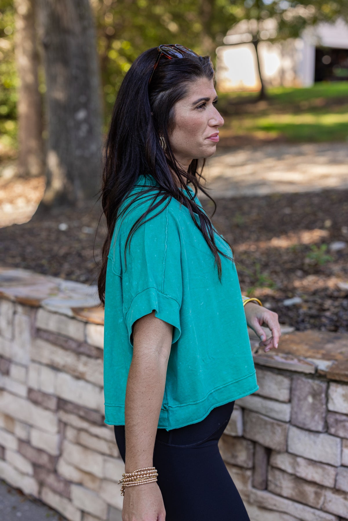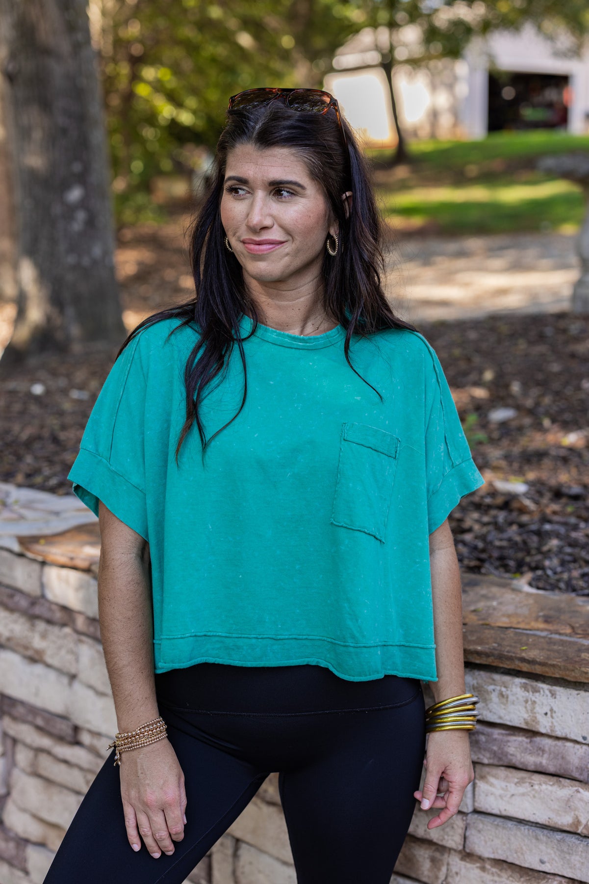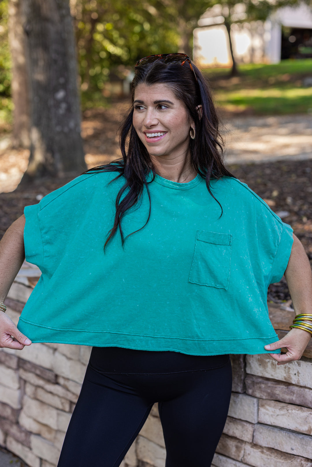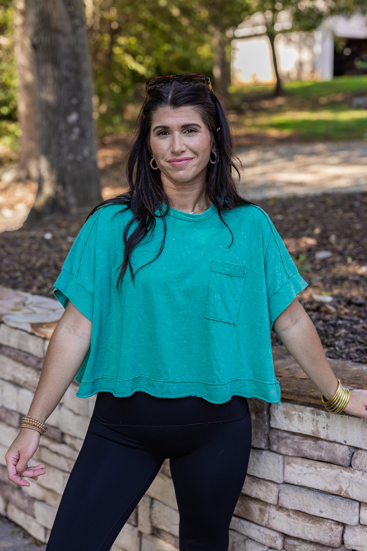 The Easy Does It Green Crop Tee will be your go-to for effortless style. This washed green tee features an easy, cropped fit with a boxy silhouette for a comfortable and casual look. Perfect to pair with your black yoga or jogger pants!