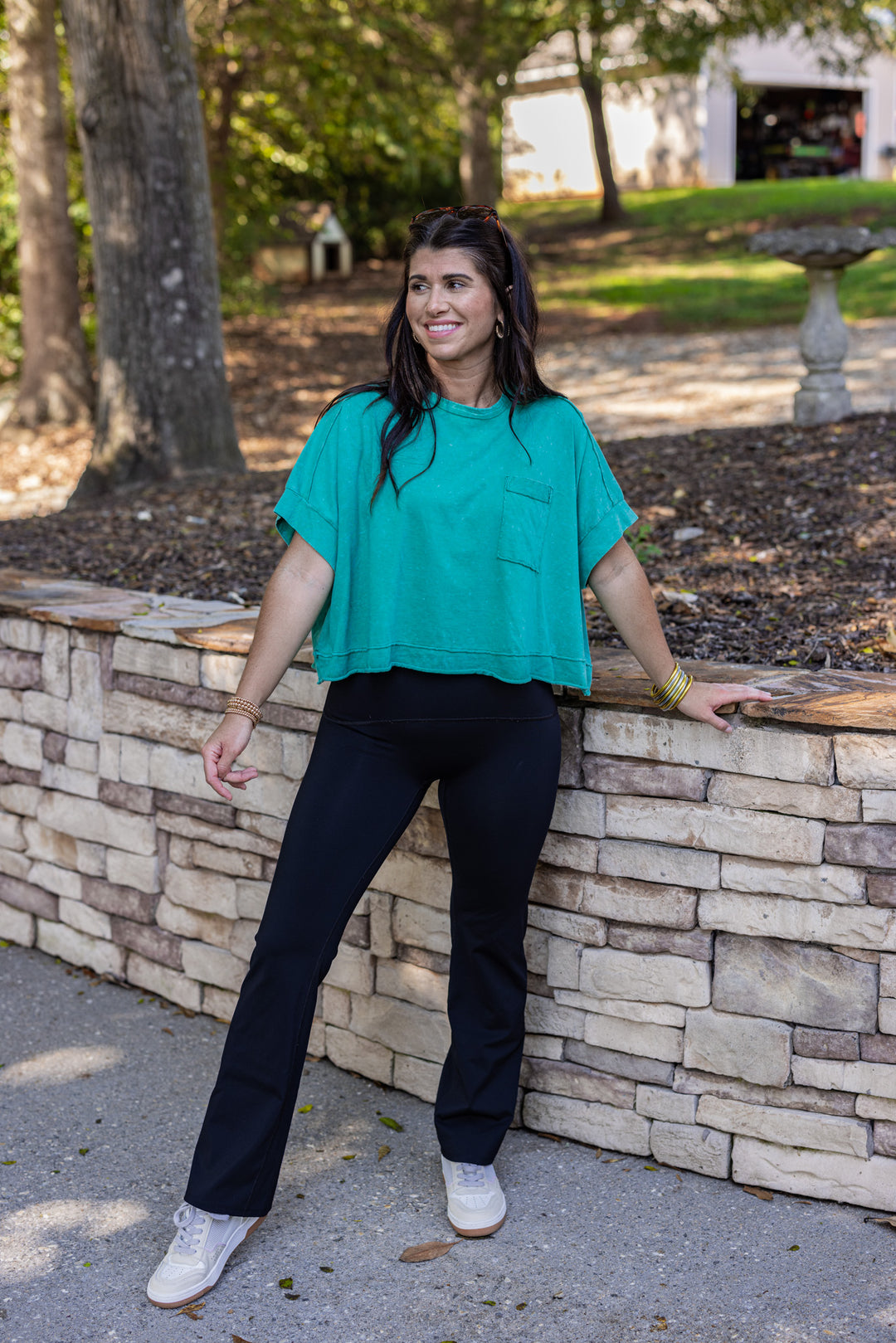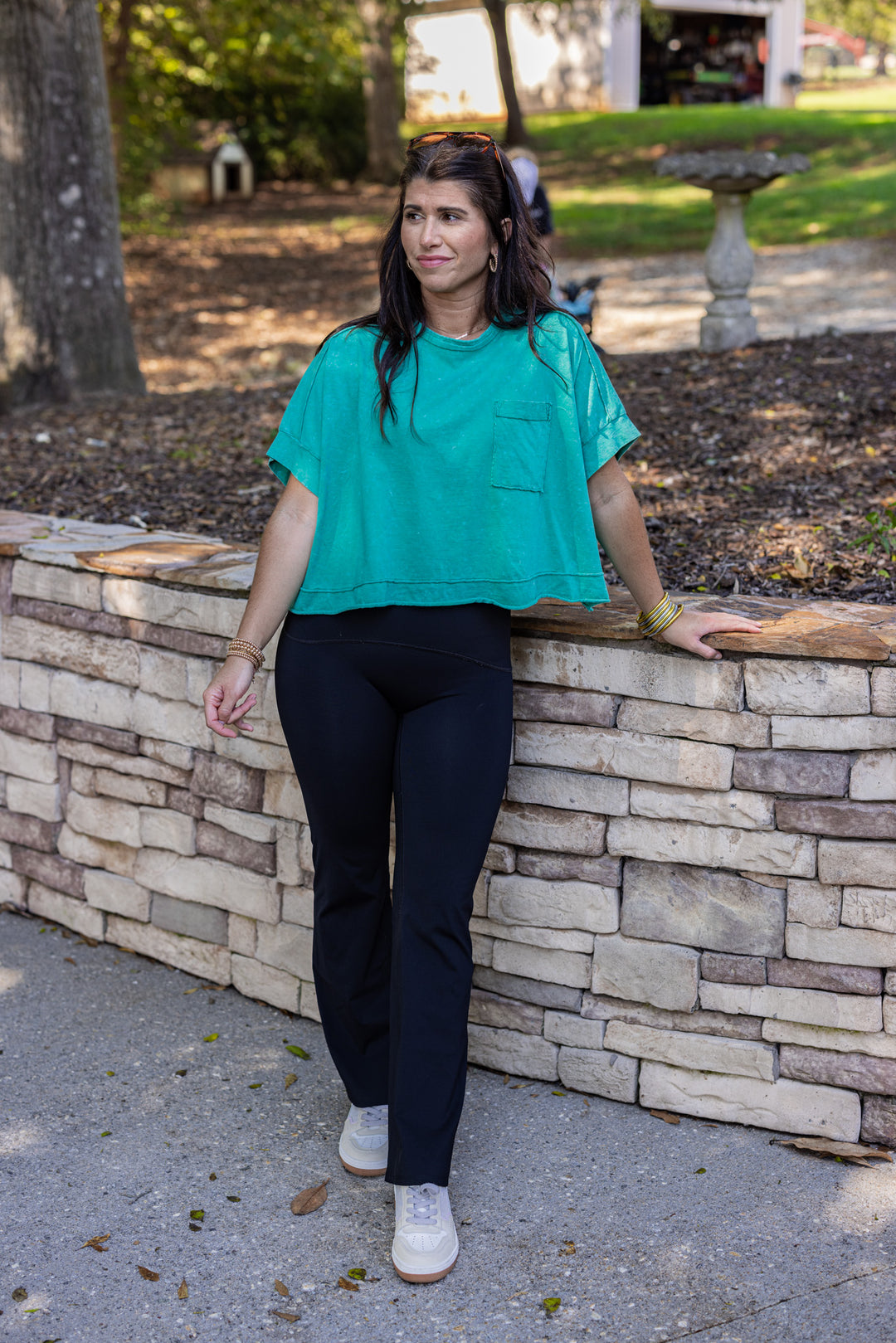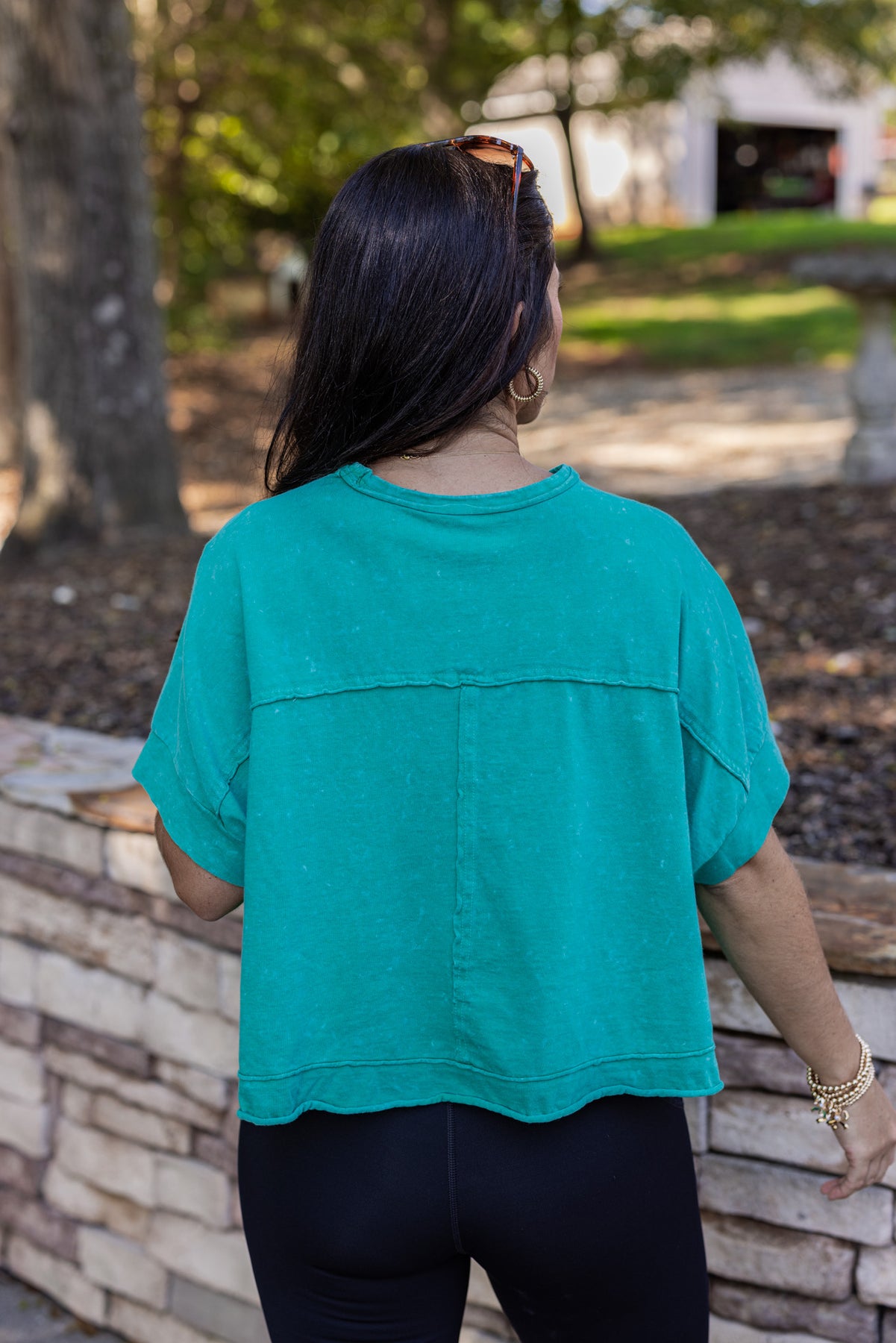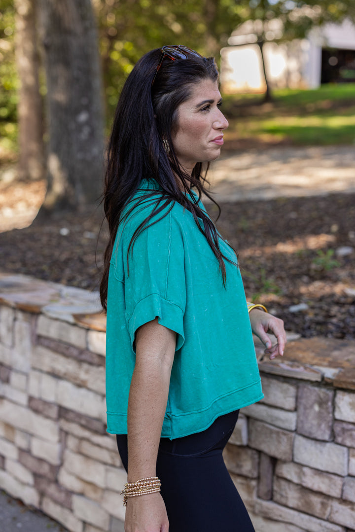 The Easy Does It Green Crop Tee will be your go-to for effortless style. This washed green tee features an easy, cropped fit with a boxy silhouette for a comfortable and casual look. Perfect to pair with your black yoga or jogger pants!