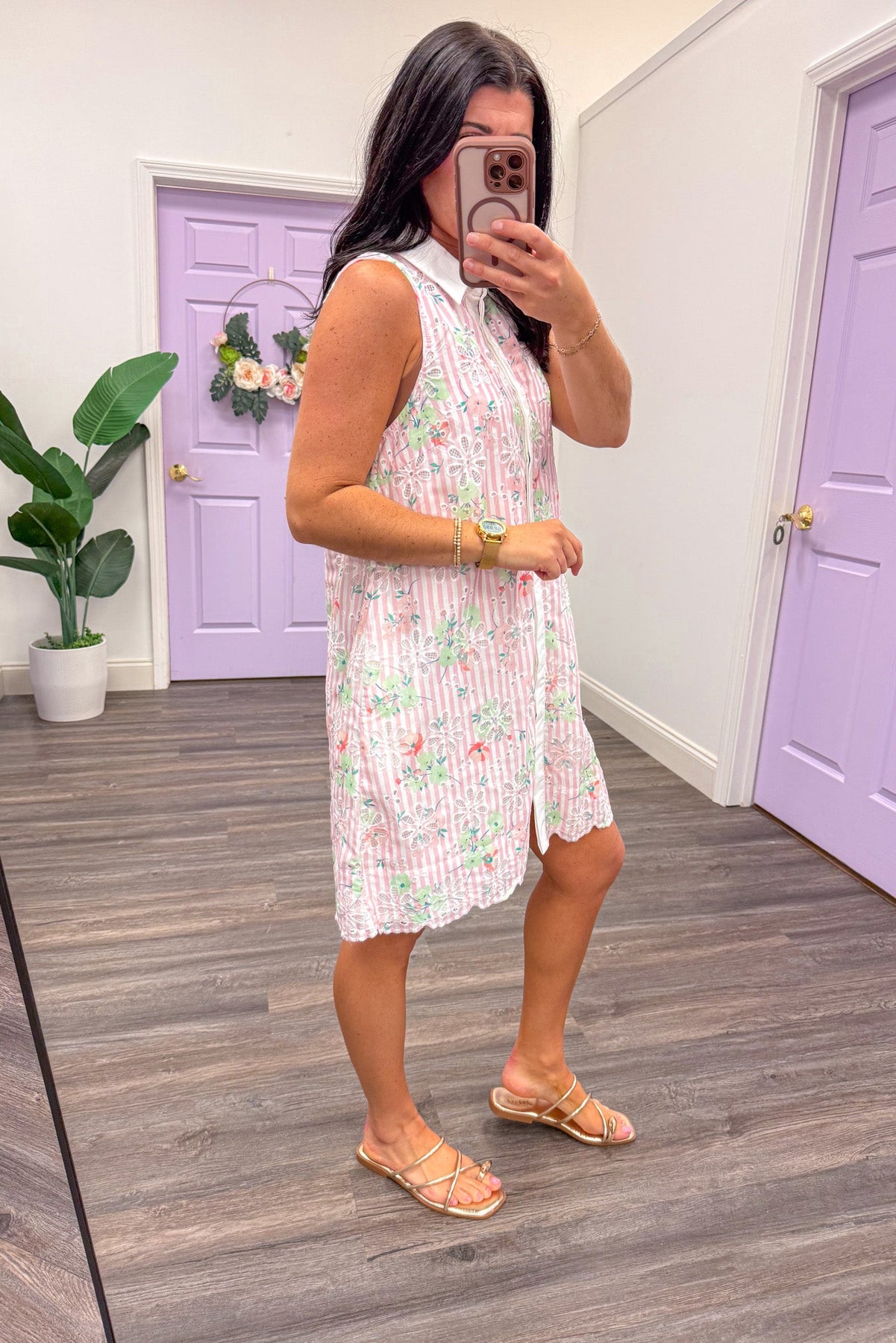 pink white striped eyelet floral dress with scalloped hem and collared neckline