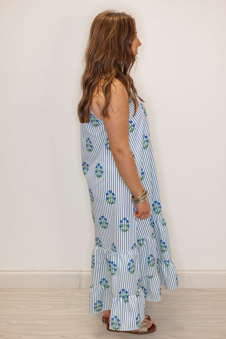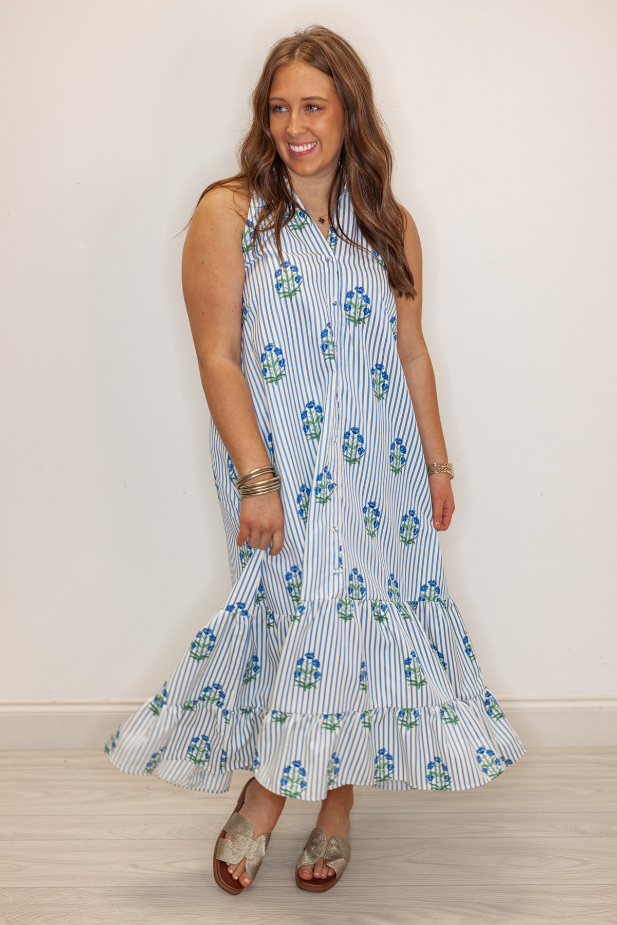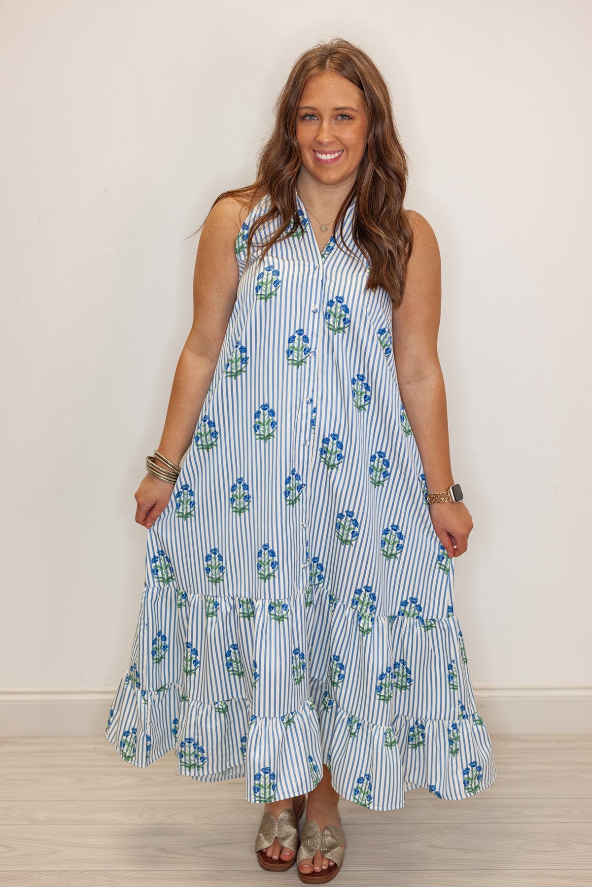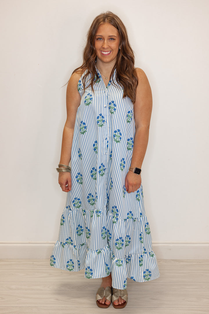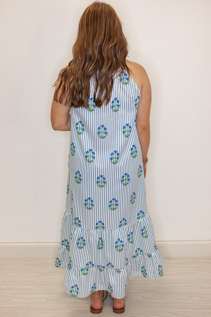 Get ready to make a statement with this Floral Striped Blue Maxi Dress! Featuring an off white and blue striped pattern, accented with a cute blue floral print, this dress is perfect for a fun, playful look. The button front closure with v neckline and halter style add a touch of sophistication, while the tiered skirt adds movement and flow. It's a must-have addition to your summer wardrobe!