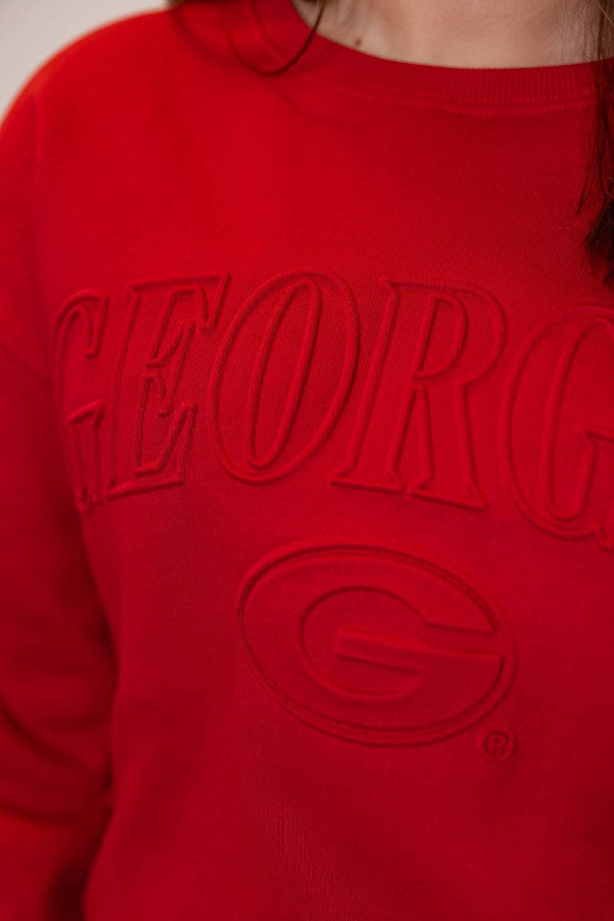 Cheer loud and proud in the Georgia Embossed red sweatshirt! This terry knit red sweatshirt offers a relaxed fit with long sleeves and a comfy crew neckline—perfect for any UGA fans! The embossed "Georgia" design adds a playful pop that’s sure to catch eyes while you show your team spirit in style.