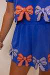 Unleash your playful side with our Gingham Bows Royal Blue Skort! Made from royal blue french terry knit fabric, this skort features a comfy elastic waistband with a skort front covering terry knit shorts. The real show-stopper? Sequin trimmed red and blue gingham bows, and a quirky laser cut bottom hem on the skort front. Prepare for compliments! Pair with the matching top for an adorable outfit that's perfect for Memorial Day and July 4th festivities!