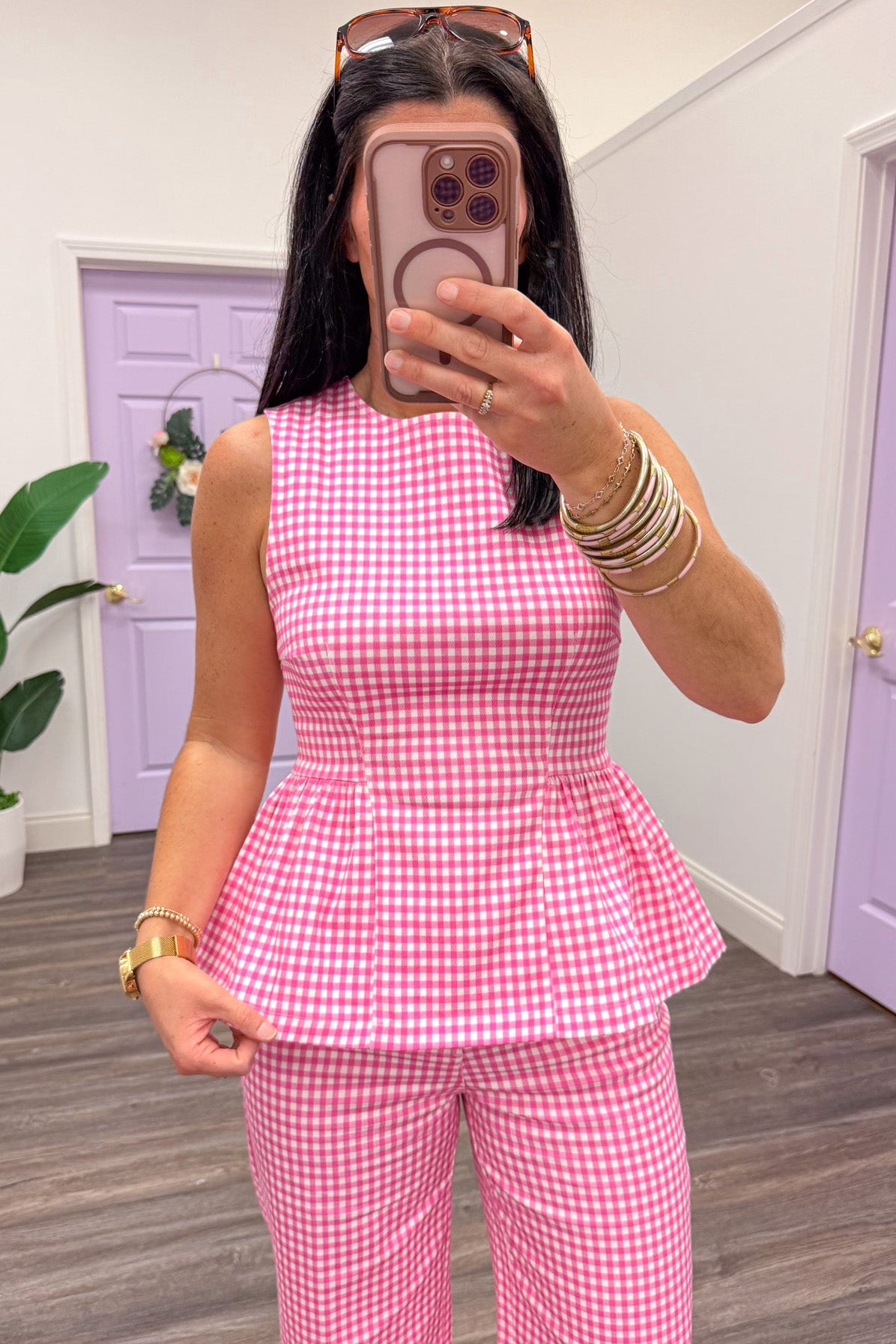 pink and white checkered gingham sleeveless crew neckline peplum top