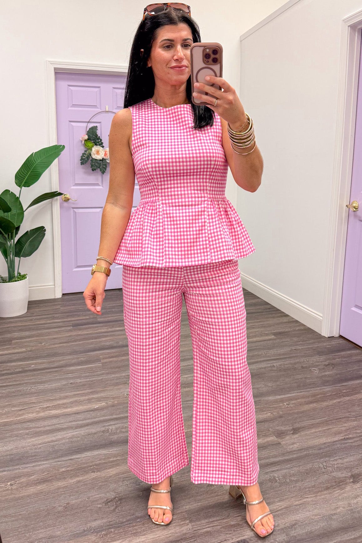 Entro pink and white gingham checkered print twill wide leg pants