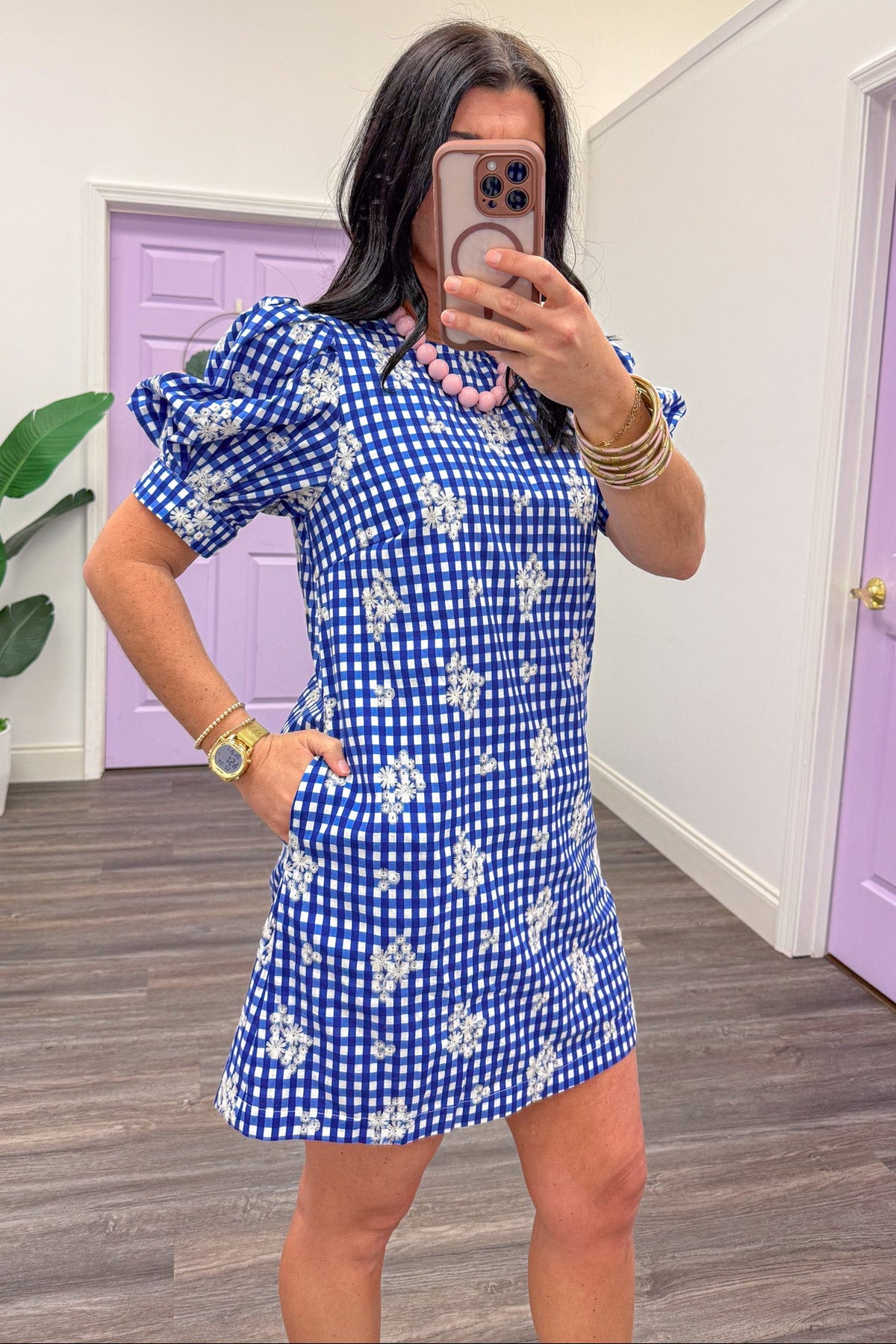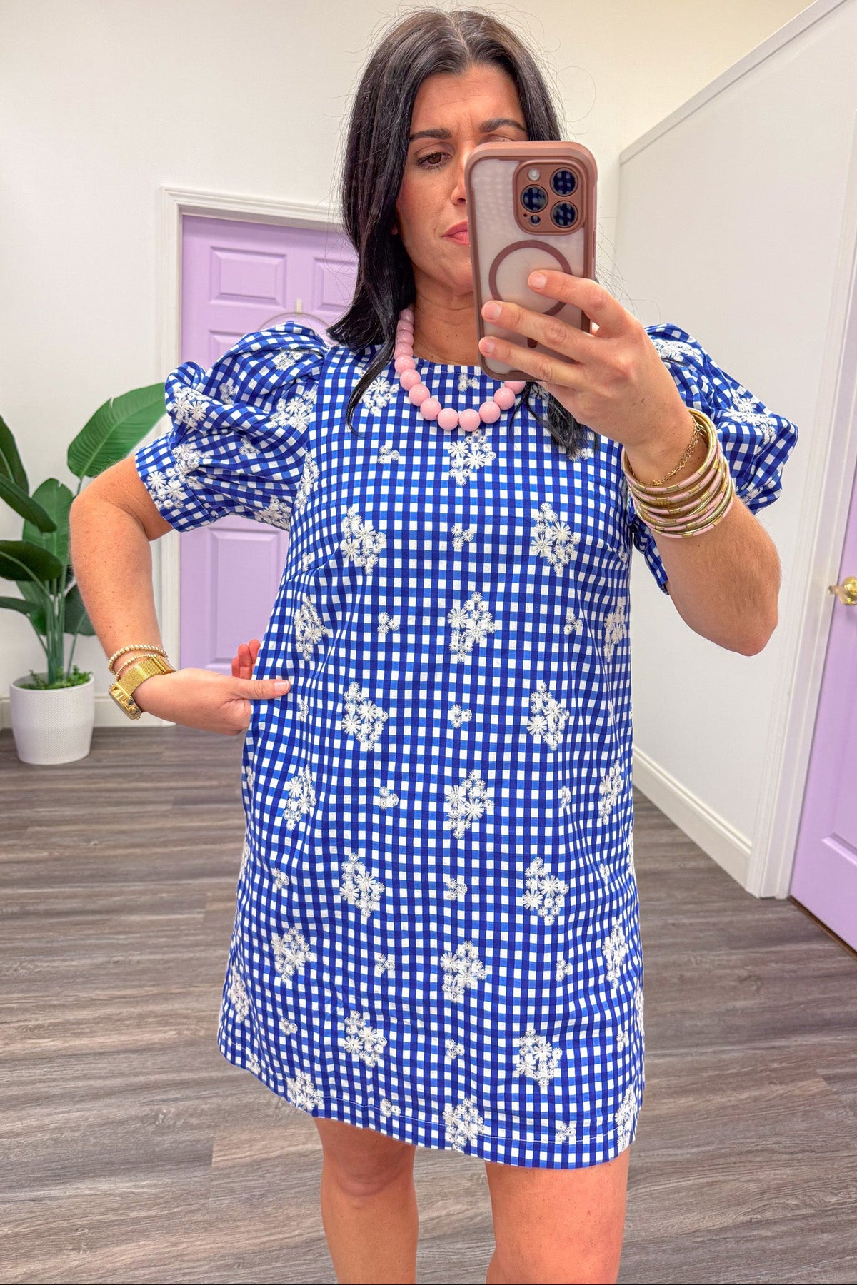Picnic weather is calling and I must go - especially with this adorable gingham dress! Crafted from royal blue and white gingham checkered poplin fabric with white embroidered flowers dancing throughout. The crew neckline ensures a comfy fit, while the puff sleeves bring a touch of whimsy. Perfect for any occasion, this versatile dress transitions beautifully from casual outings to special events all season long!