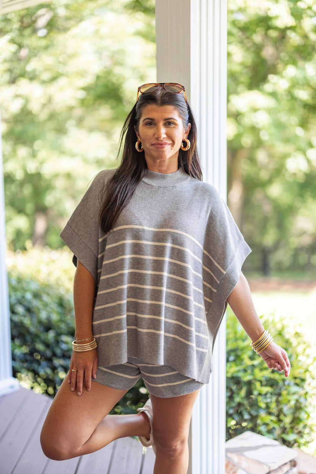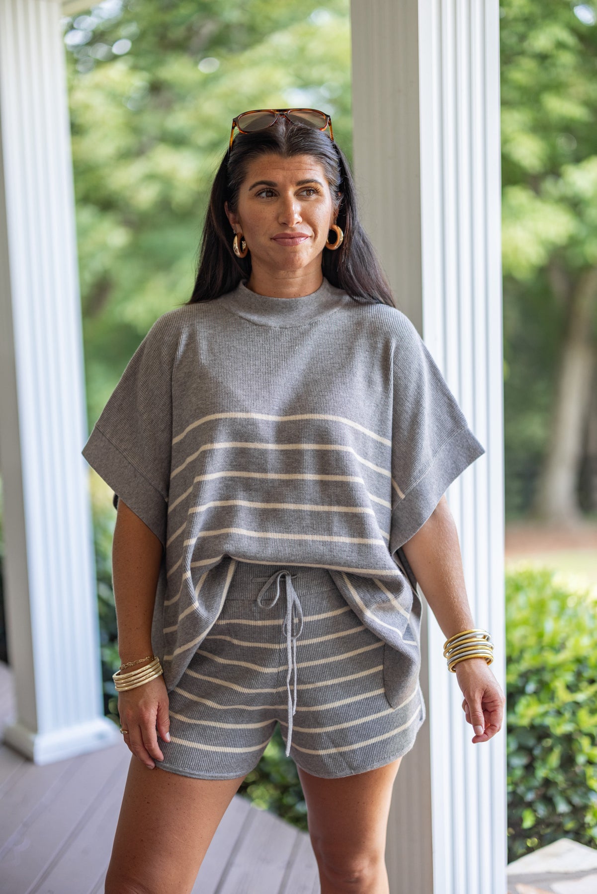 Fall in love with the trendy comfort of our Everyday Chic shorts! Made with heather grey and beige striped knit fabric, these shorts feature an elastic waistband with an adjustable drawstring. Just perfect! Complete the look with our matching top for a chic, stylish outfit. Luxuriously soft, high quality fabric!!