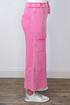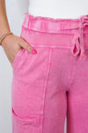 These terry knit pants are both trendy and comfy! Mineral washed barbie pink french terry knit fabric, featuring drawstring elastic waistband, side pockets, front pockets above the knee, back pockets, wide legs, raw bottom hemline, and reverse seam details throughout. You will love how great you feel in these babes everyday! Dress them up or down!