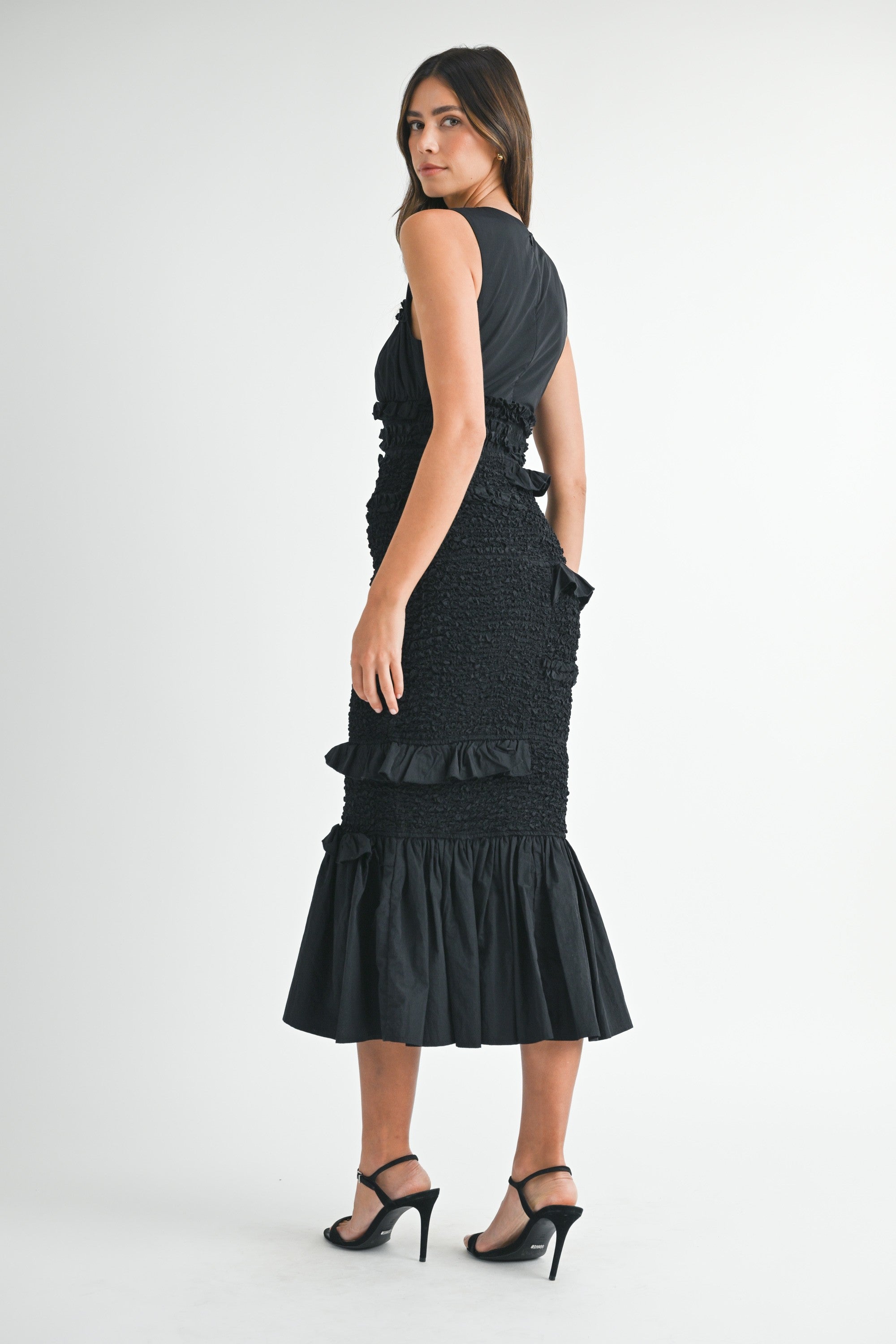 Mermaid Smocked Black Midi Dress. The ruffled tiered design adds a playful touch to the fitted silhouette, while the smocked design ensures a perfect fit.