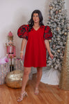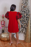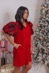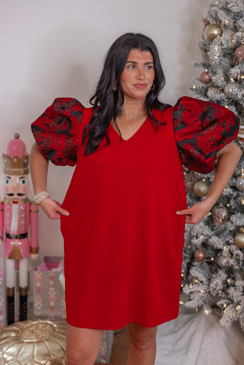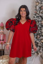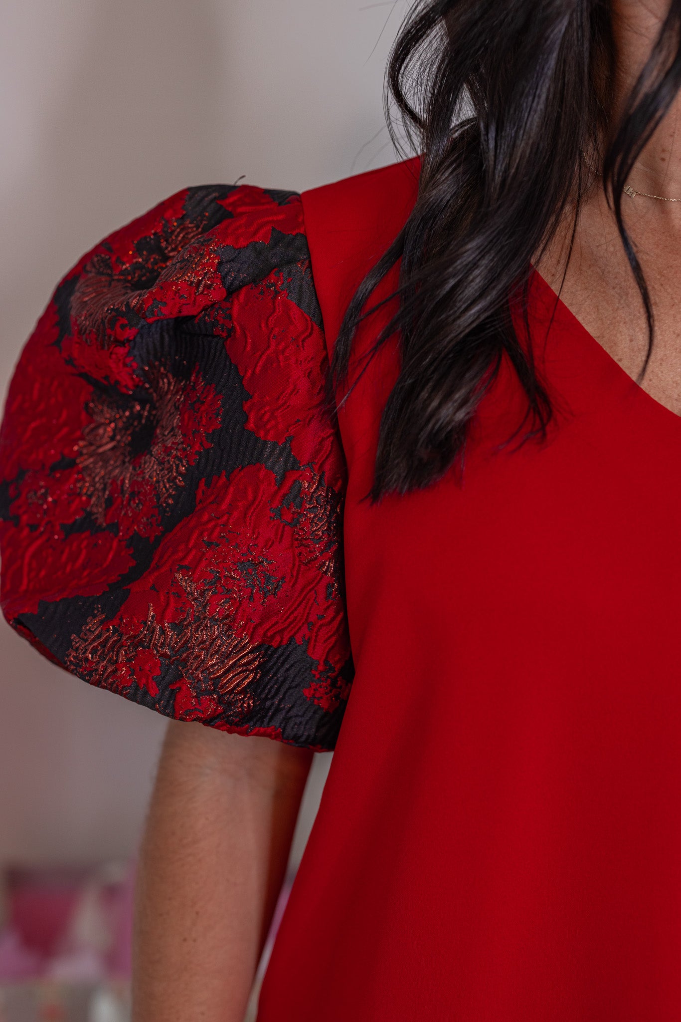 Keep your style sassy with our Metallic Puff Sleeve Red Dress! Made with red fabric, a v neckline, and gathered elastic short puff jacquard sleeves with red, black, and metallic details that's sure to turn heads. Ready for a metallic-powered upgrade? Just grab your fave heels and go... perfect for the upcoming season celebrations!