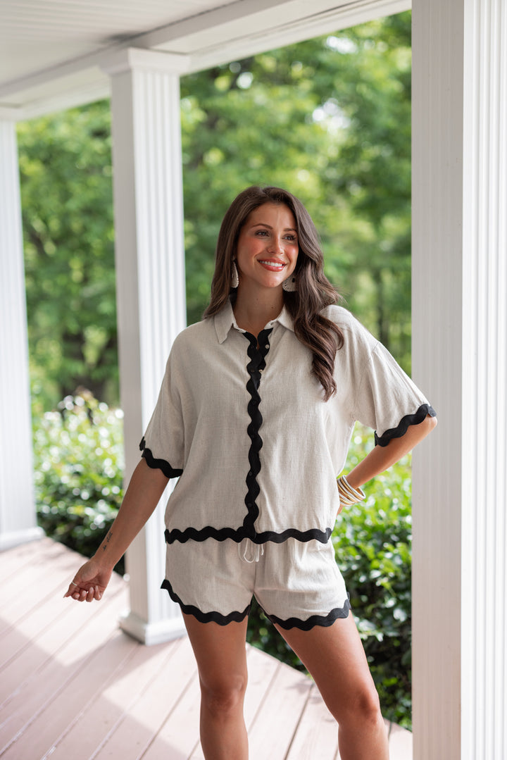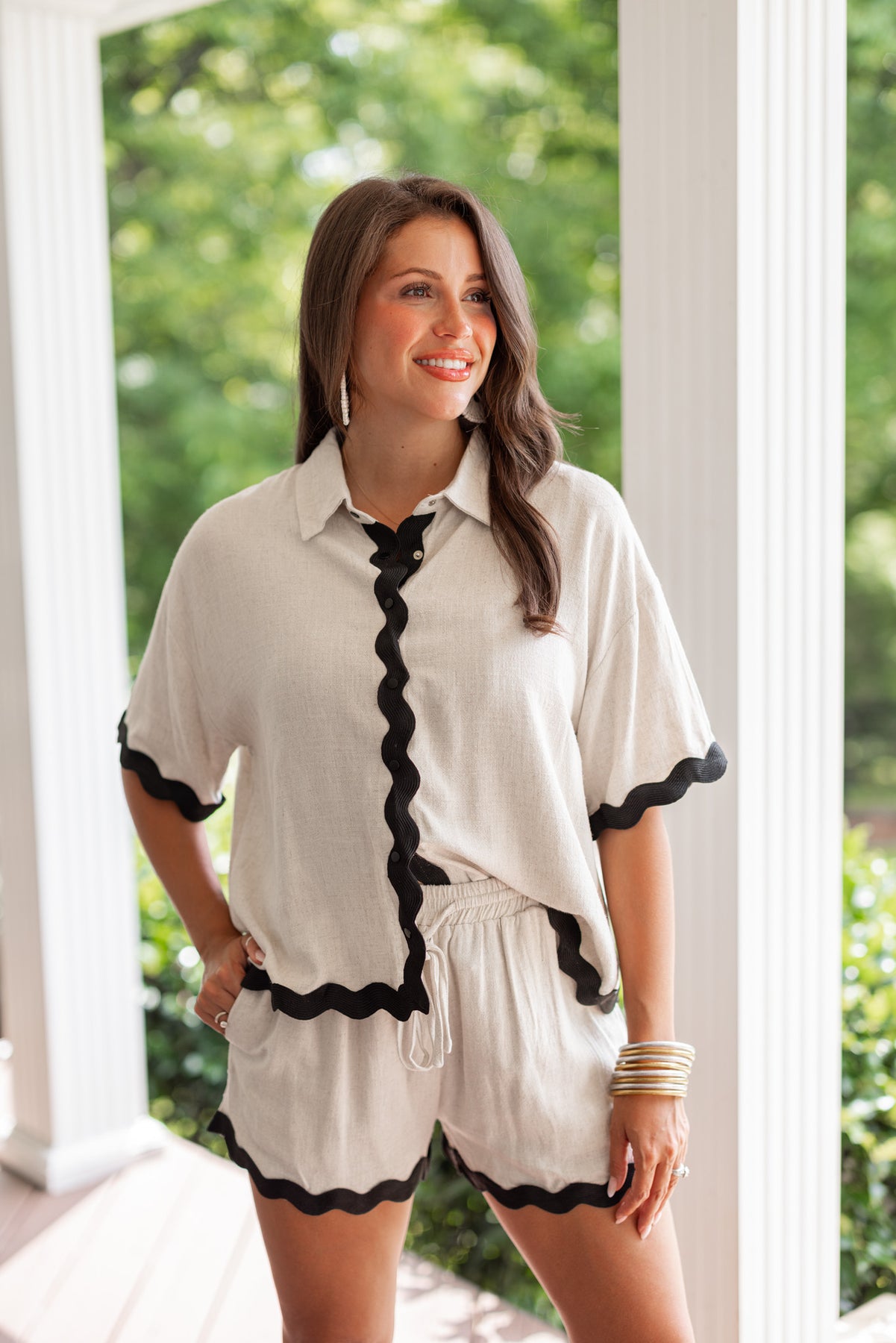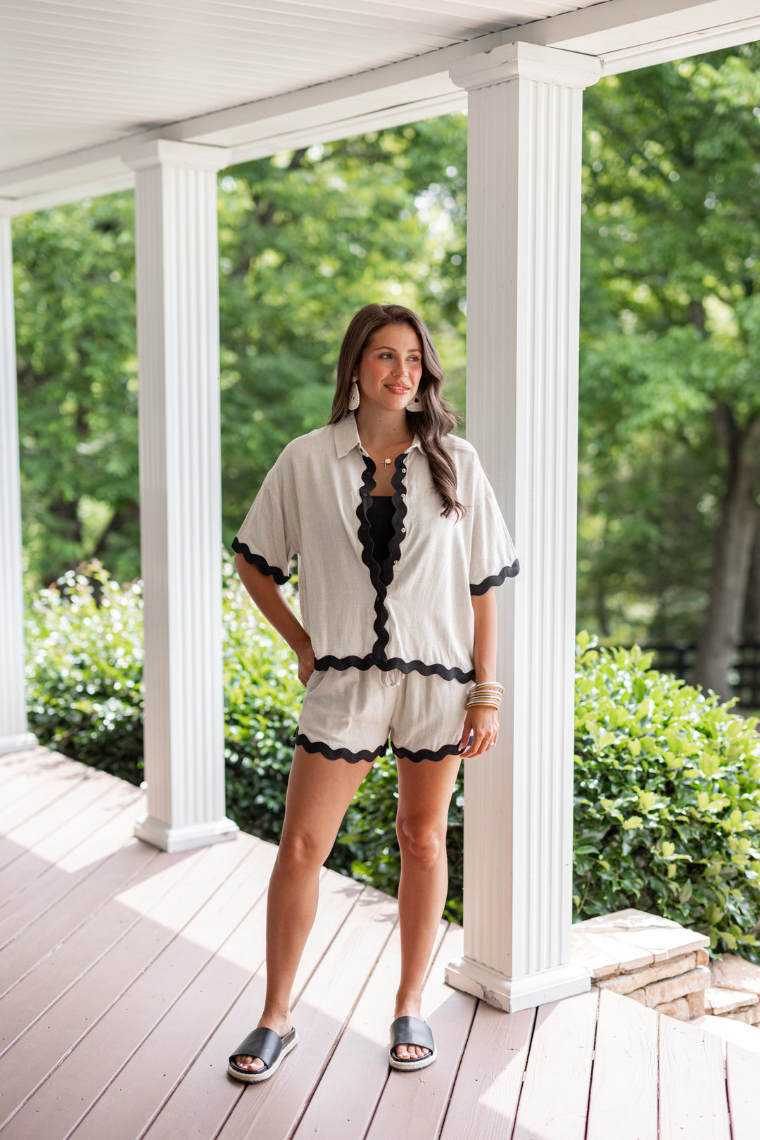 Get ready to stand out in style with our Coastal Views Natural Colorblock Set! Made with natural fabric and black scalloped ric rac trim, this set is not only trendy but also comfortable. Featuring a snap front short sleeve top and elastic waist shorts, she's perfect for a day of fun in the sun. You can wear the top closed, or open with a tank underneath. Lots of options with this cute set!