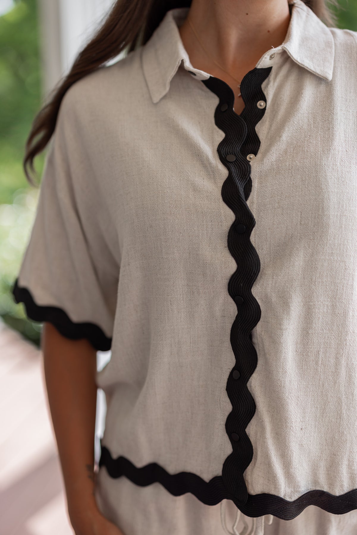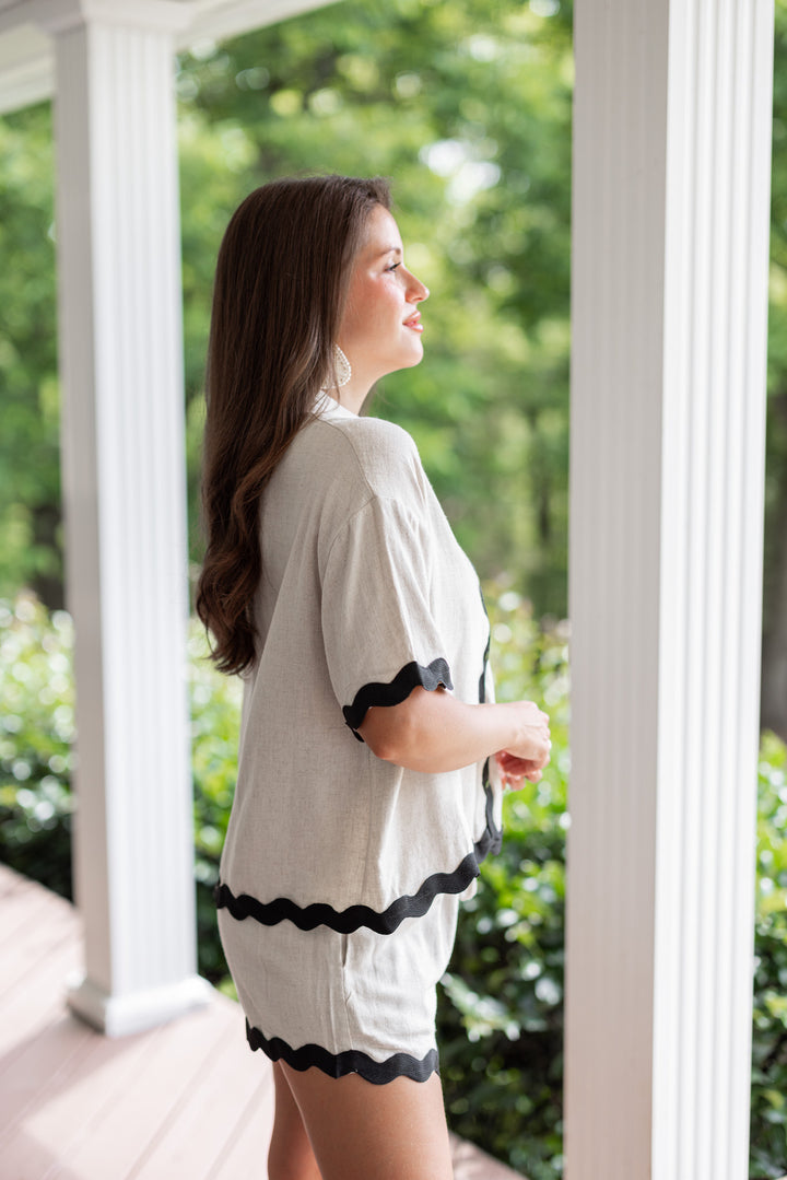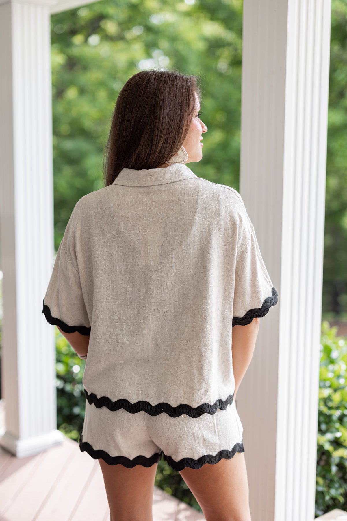 Get ready to stand out in style with our Coastal Views Natural Colorblock Set! Made with natural fabric and black scalloped ric rac trim, this set is not only trendy but also comfortable. Featuring a snap front short sleeve top and elastic waist shorts, she's perfect for a day of fun in the sun. You can wear the top closed, or open with a tank underneath. Lots of options with this cute set!