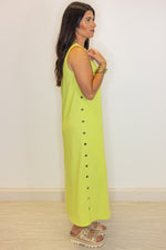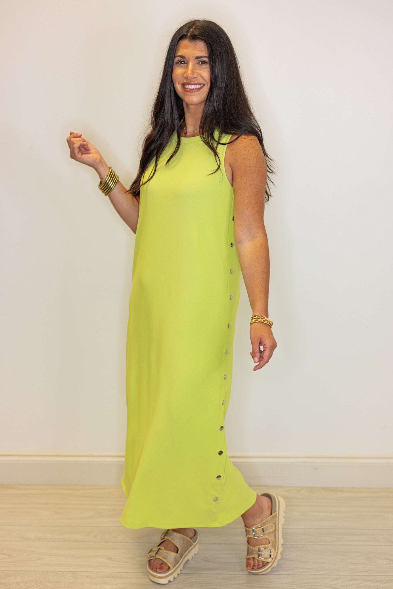 Embrace new beginnings in this playful lime midi dress! Made from ribbed fabric, it features a crew neckline and sleeveless design. Button accents down each side add a touch of whimsy. Get ready to turn heads and make a statement, as you step out in style!