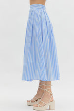 Get ready for vacation season in our Oceanside Stripes Blue Midi Skirt! With a playful blue and light blue striped print, and decorative pleats, this flowy skirt will definitely make a statement. Featuring a smooth waistline in front with elastic in back for a comfy fit, she's perfect for those who love to stand out in style! Pair with the matching top for the dreamiest Summer outfit!