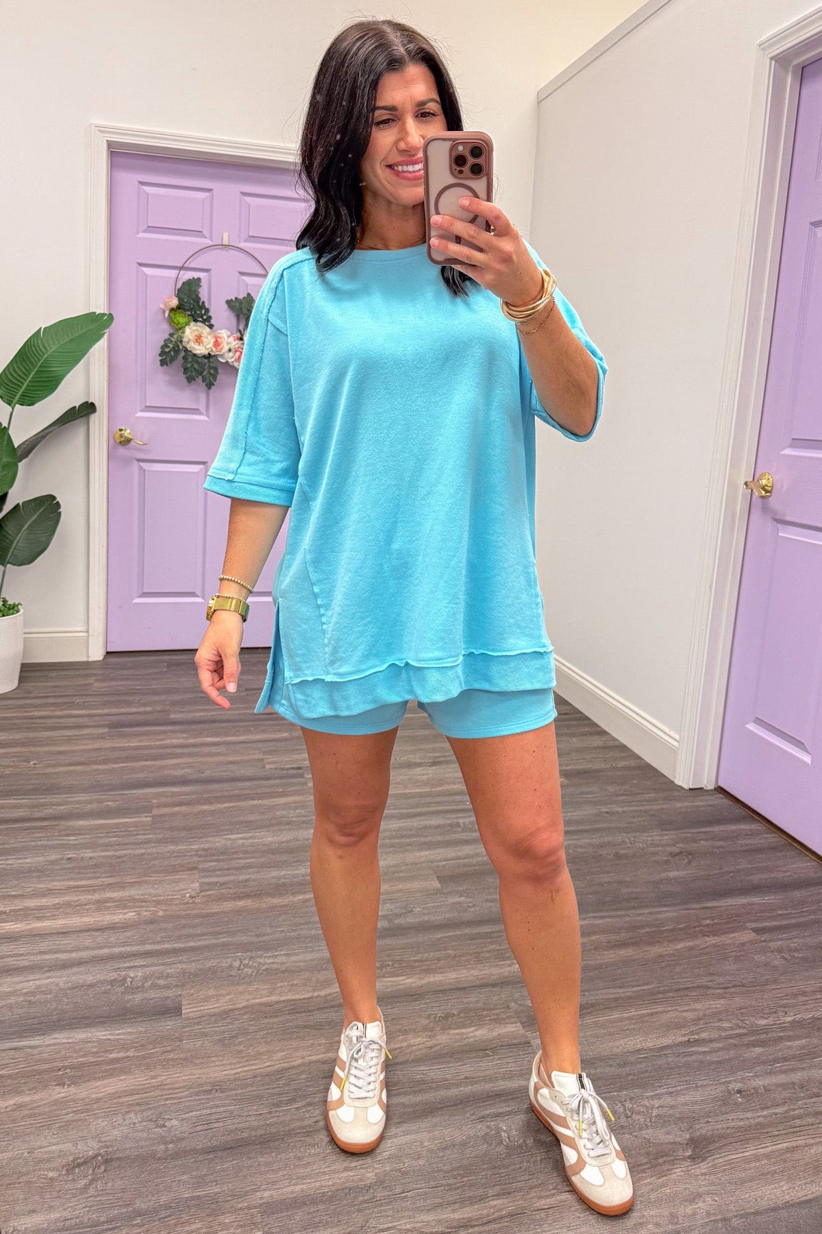 teal blue elastic band athleisure lounge shorts side pockets