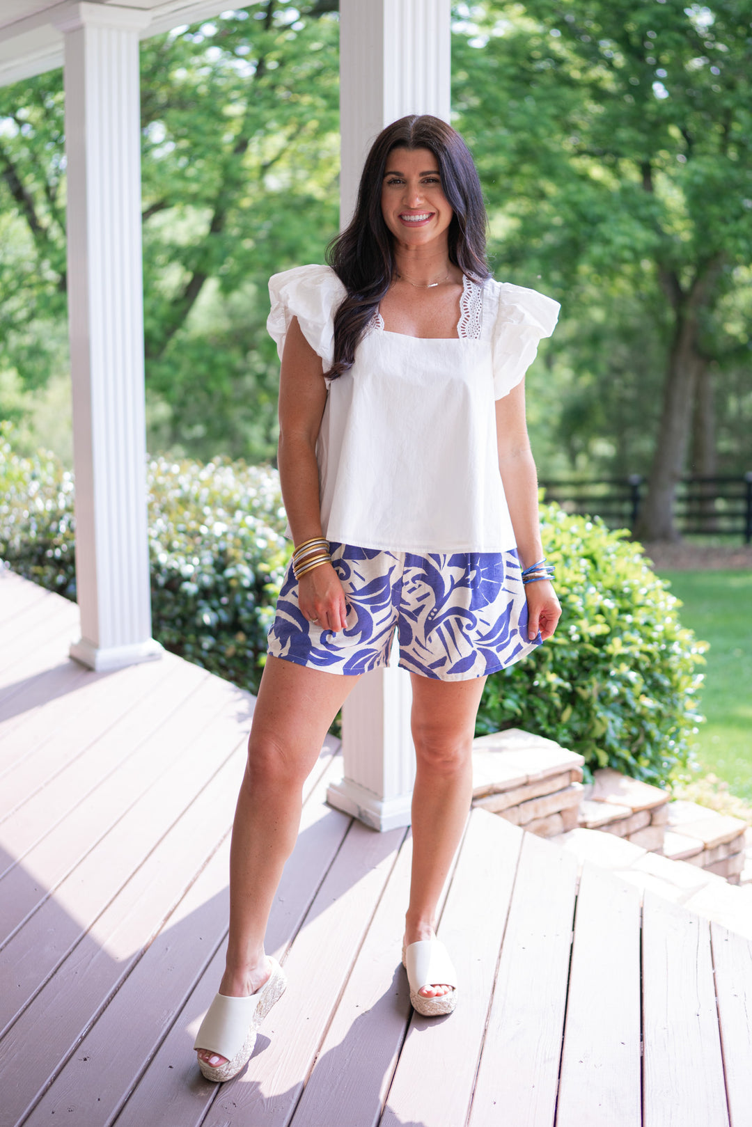This adorable babe is the perfect Summer top! Off white lightweight fabric, featuring a square neckline that ties in back, embroidered eyelet detail at shoulders, and gathered elastic short puff sleeves. We just love a pretty peasant blouse! Wear her with shorts and sandals for a hot Summer day out, or a flowy skirt and boots for a boho vibe. Shop the look: Shorts | Sandals
