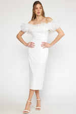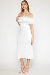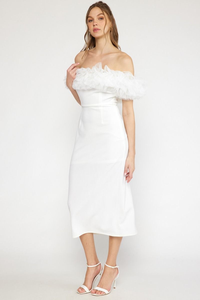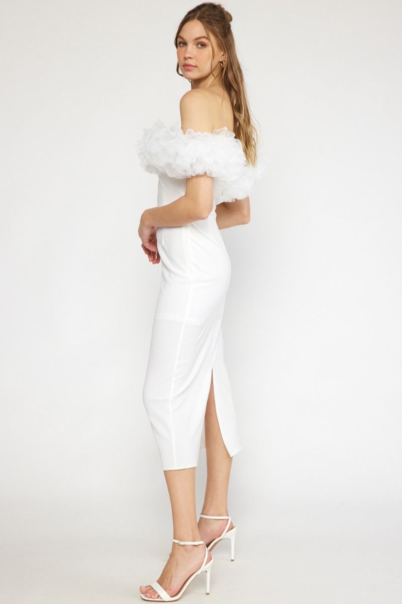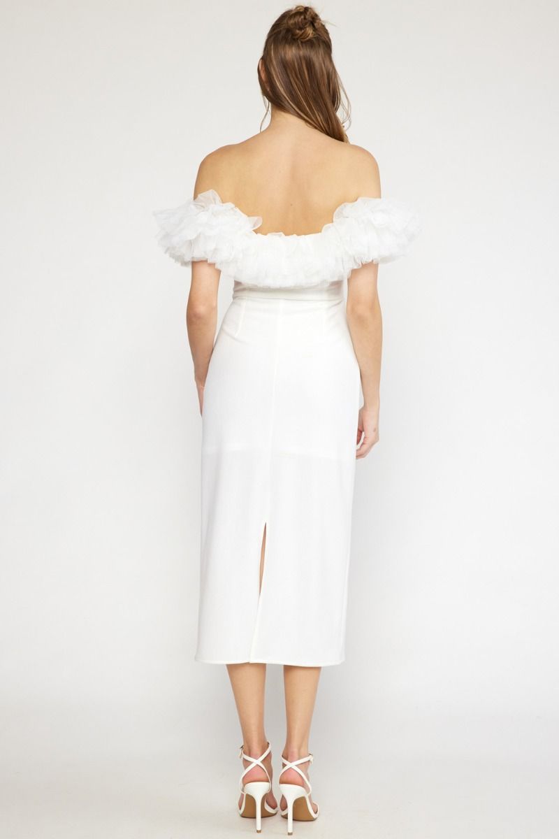 Off the shoulder tulle trim midi dress in off white